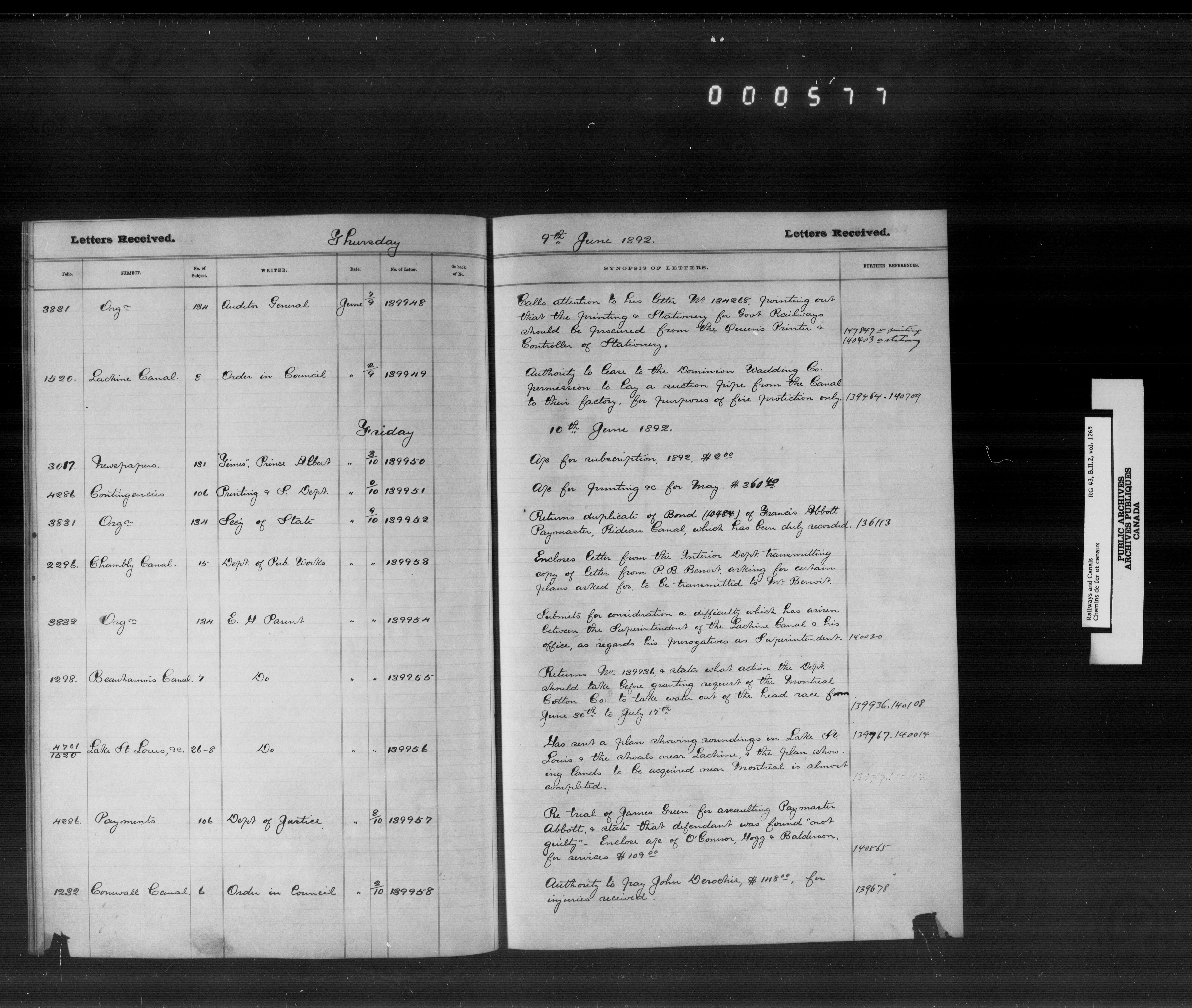 Department of Railways and Canals, Canal Branch : Registers of letters received between January 1881 and December 1892 - 7207