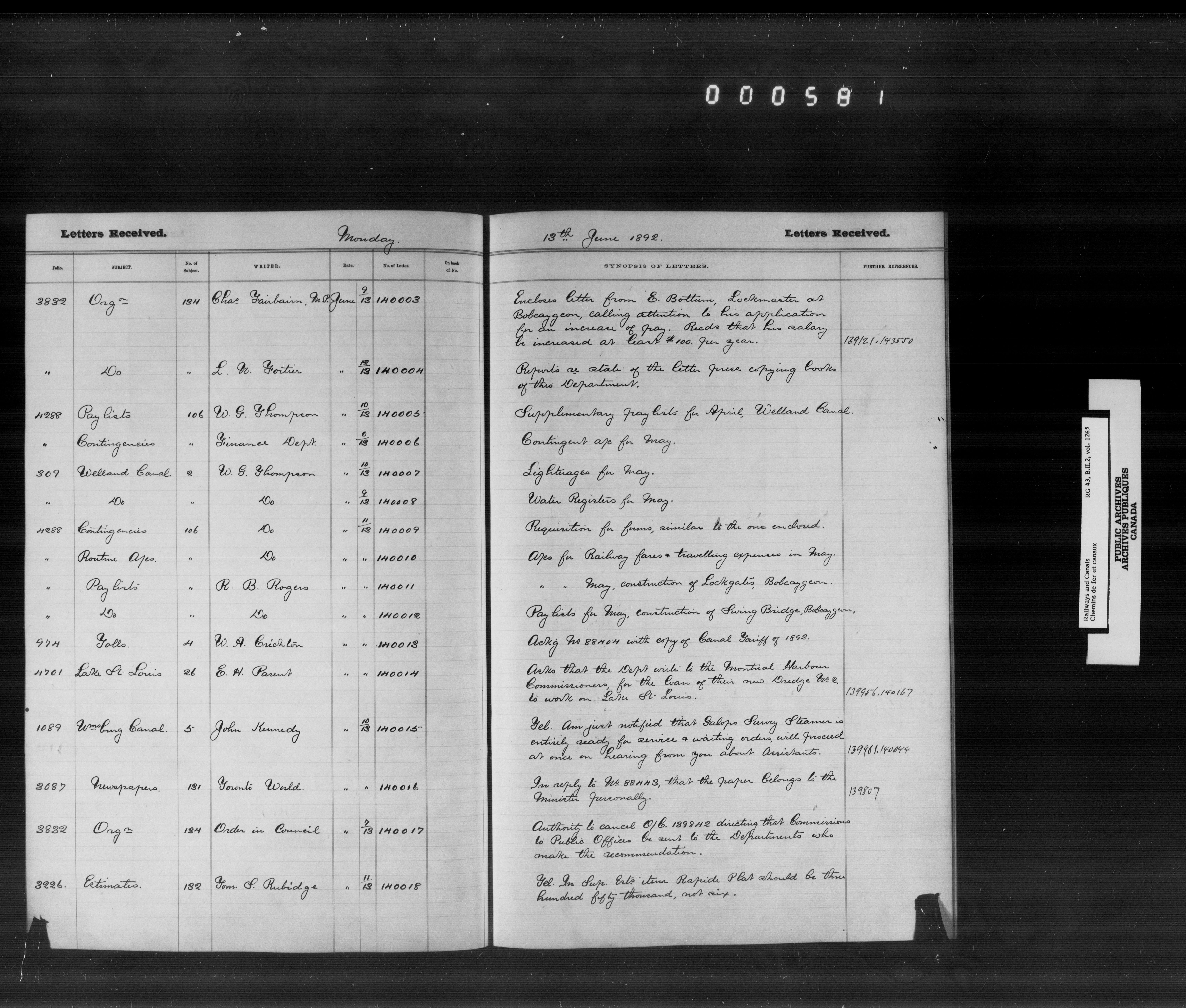 Department of Railways and Canals, Canal Branch : Registers of letters received between January 1881 and December 1892 - 7207