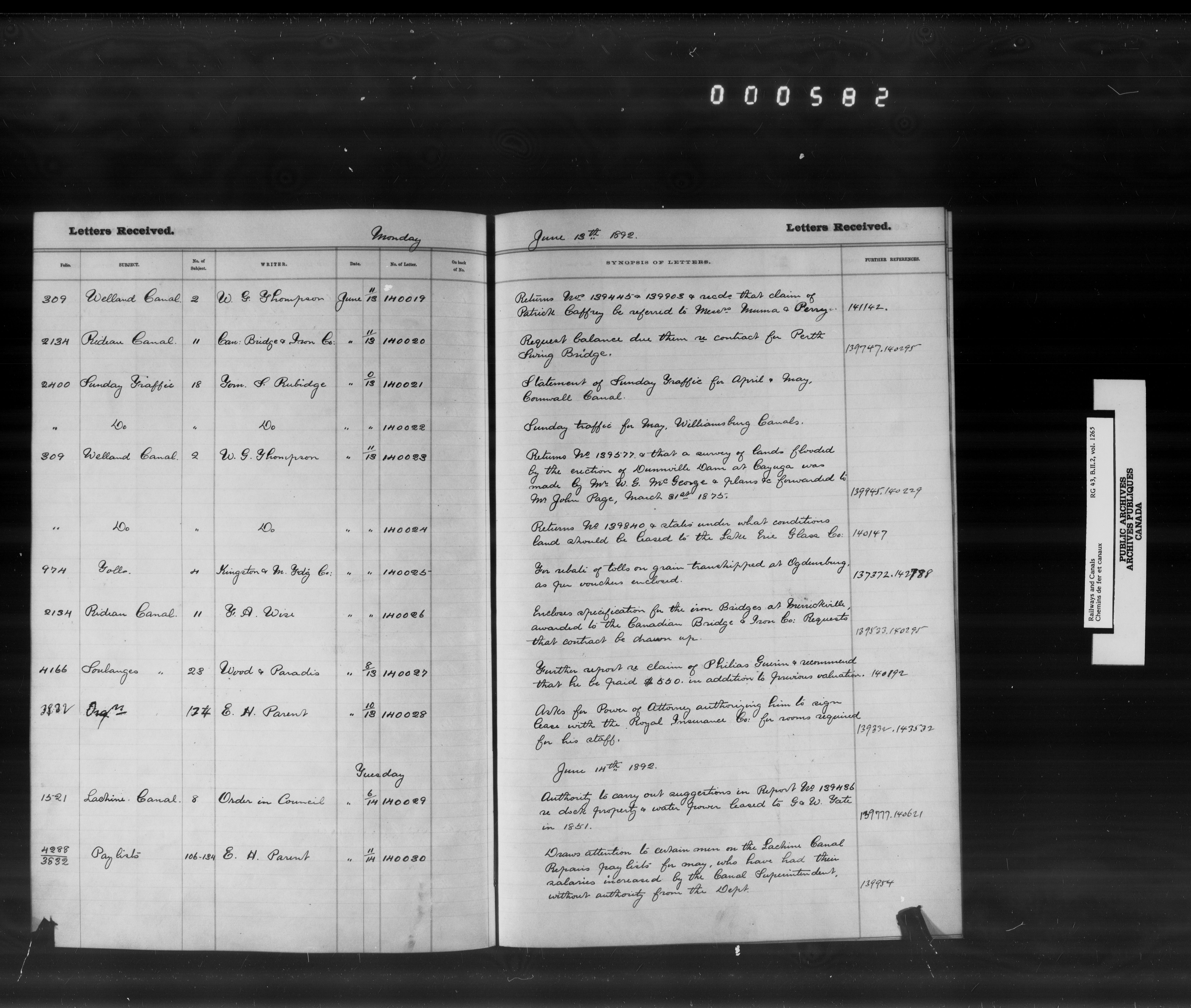 Department of Railways and Canals, Canal Branch : Registers of letters received between January 1881 and December 1892 - 7207