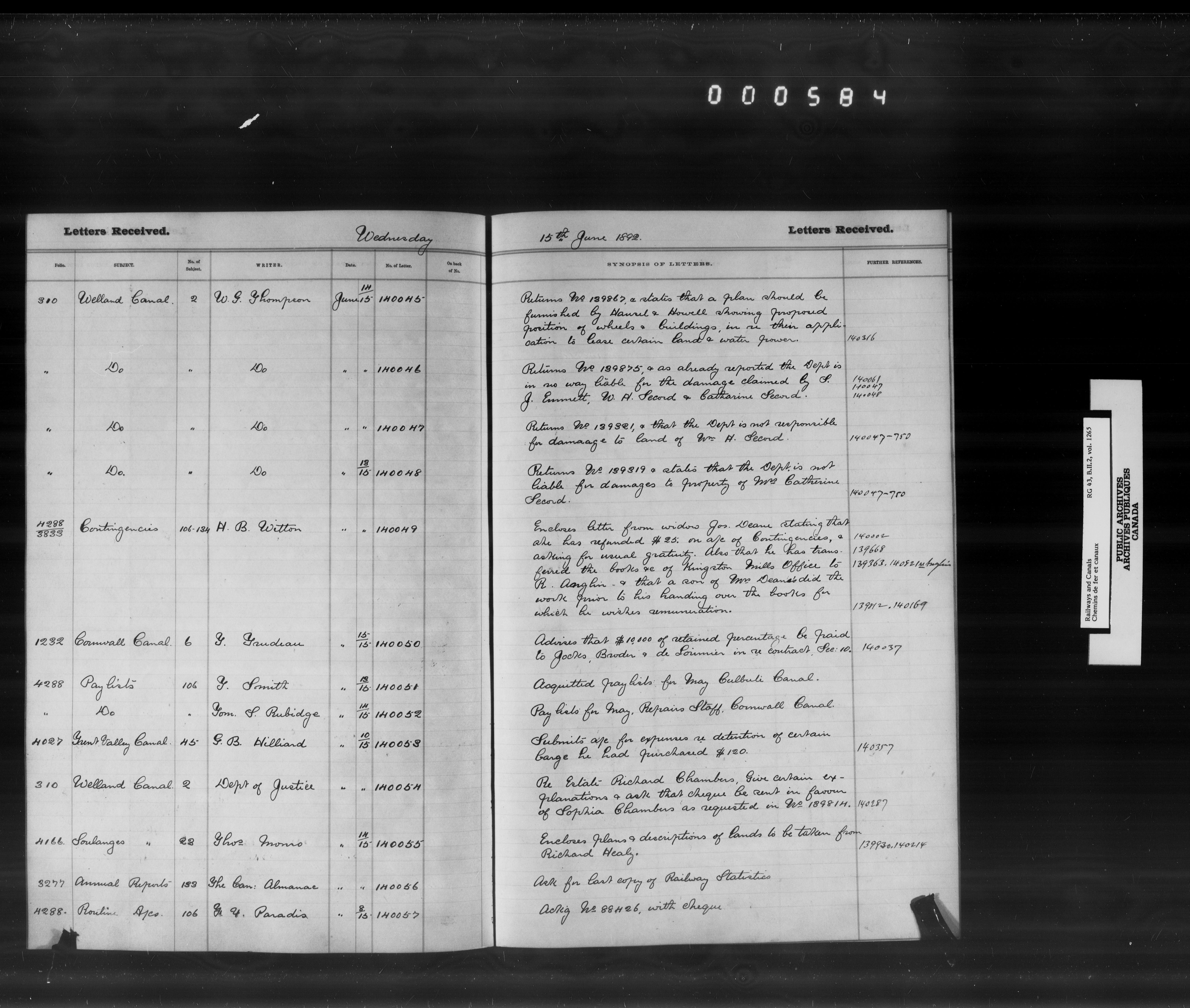 Department of Railways and Canals, Canal Branch : Registers of letters received between January 1881 and December 1892 - 7207