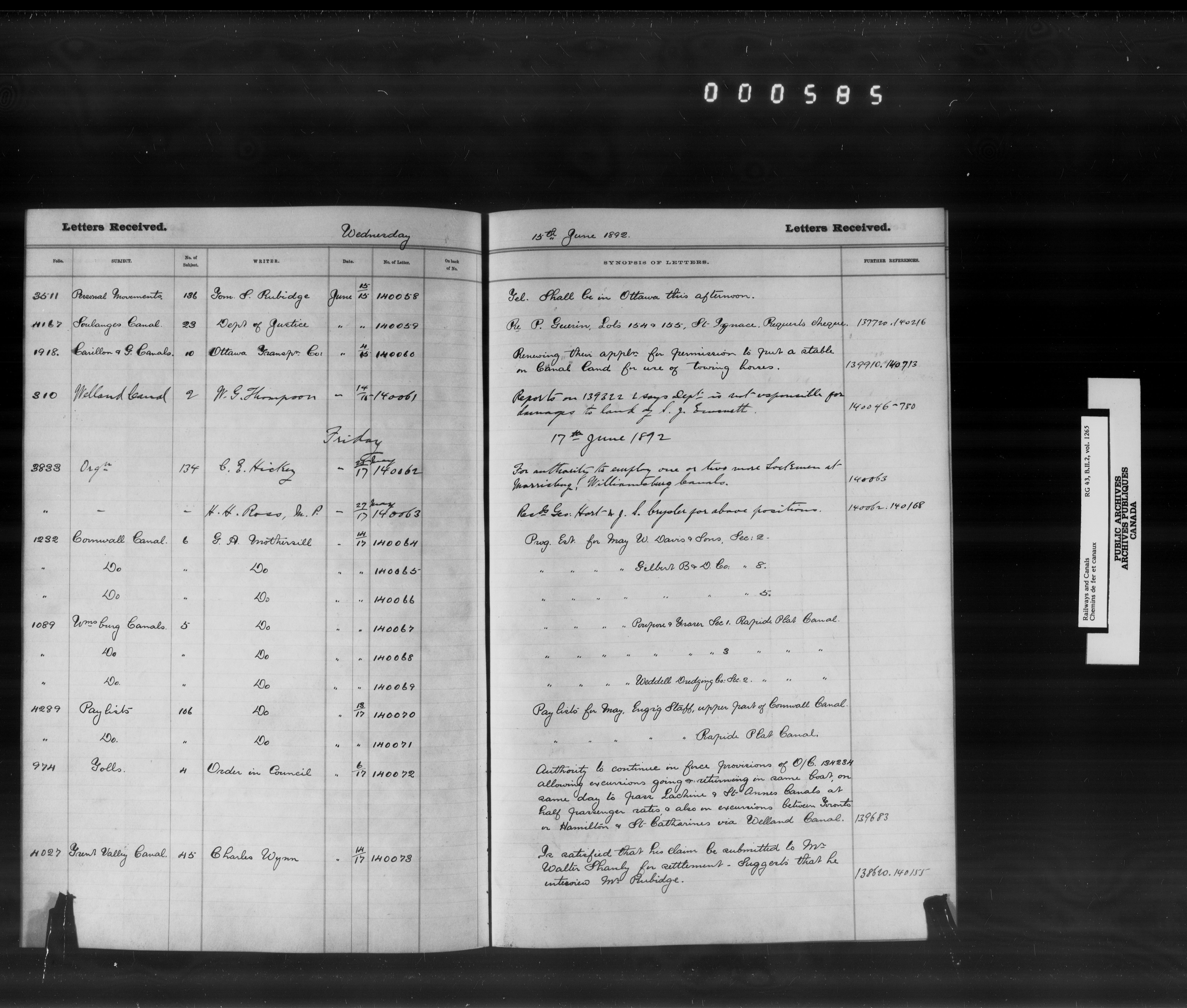 Department of Railways and Canals, Canal Branch : Registers of letters received between January 1881 and December 1892 - 7207