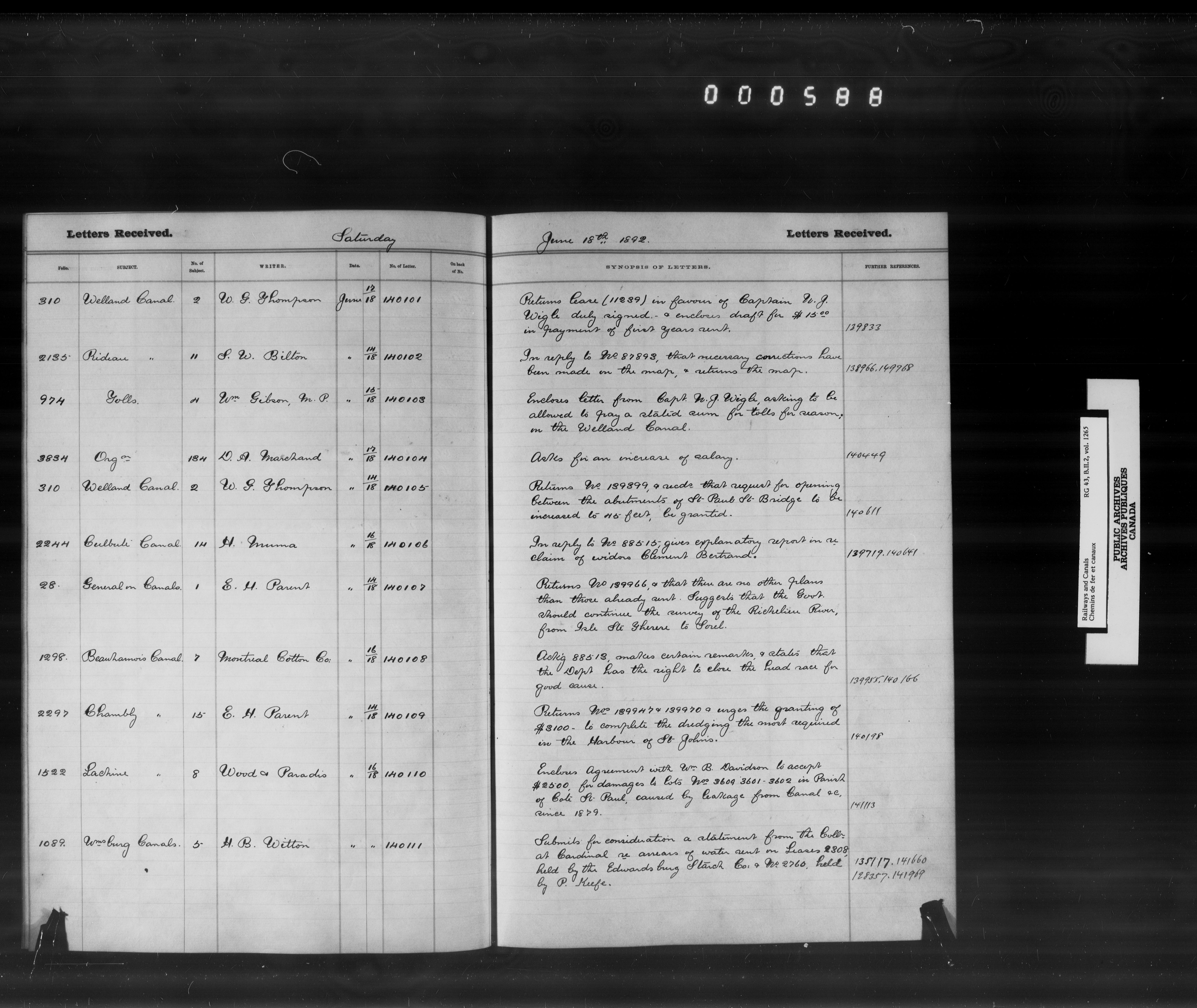 Department of Railways and Canals, Canal Branch : Registers of letters received between January 1881 and December 1892 - 7207