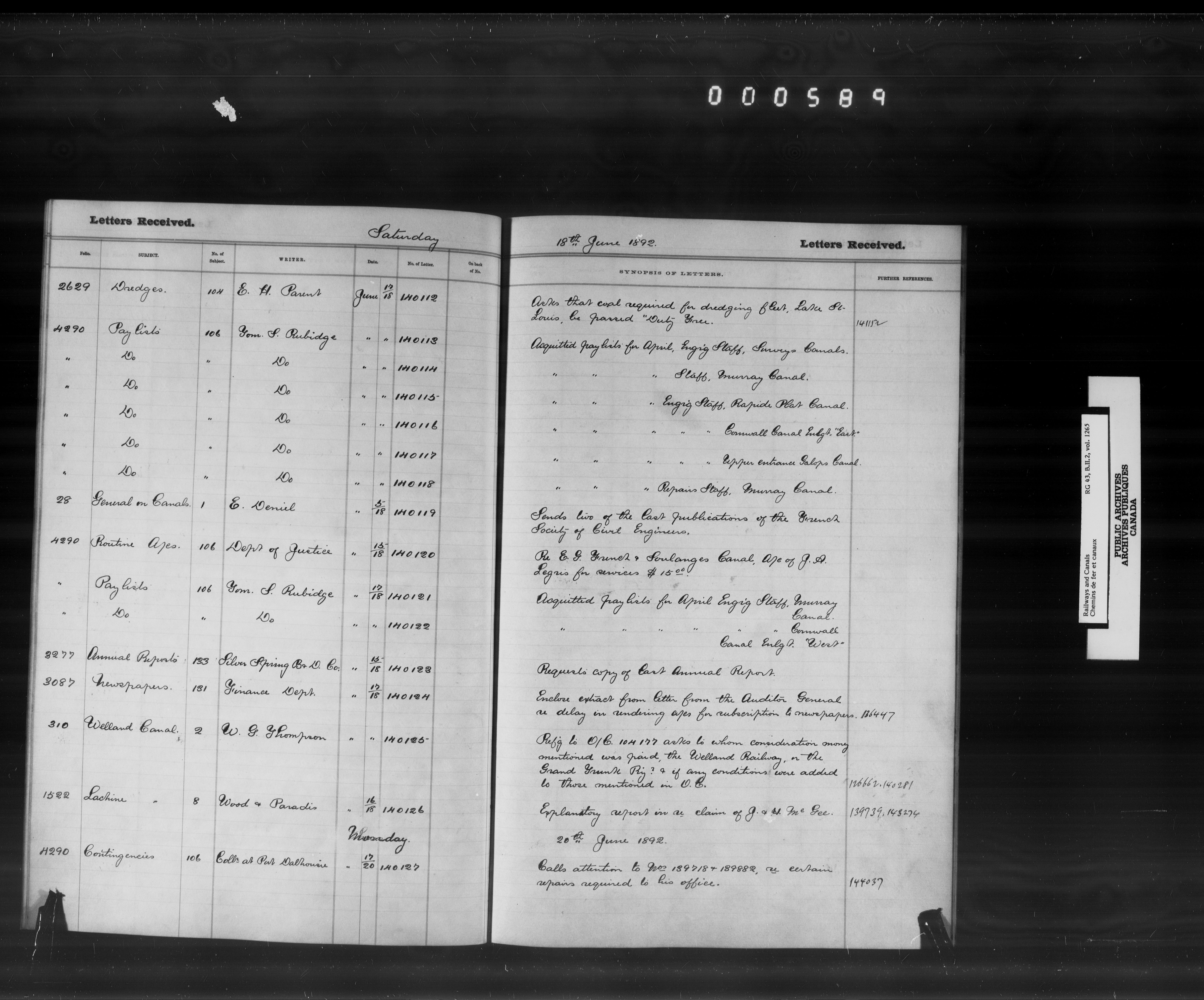 Department of Railways and Canals, Canal Branch : Registers of letters received between January 1881 and December 1892 - 7207