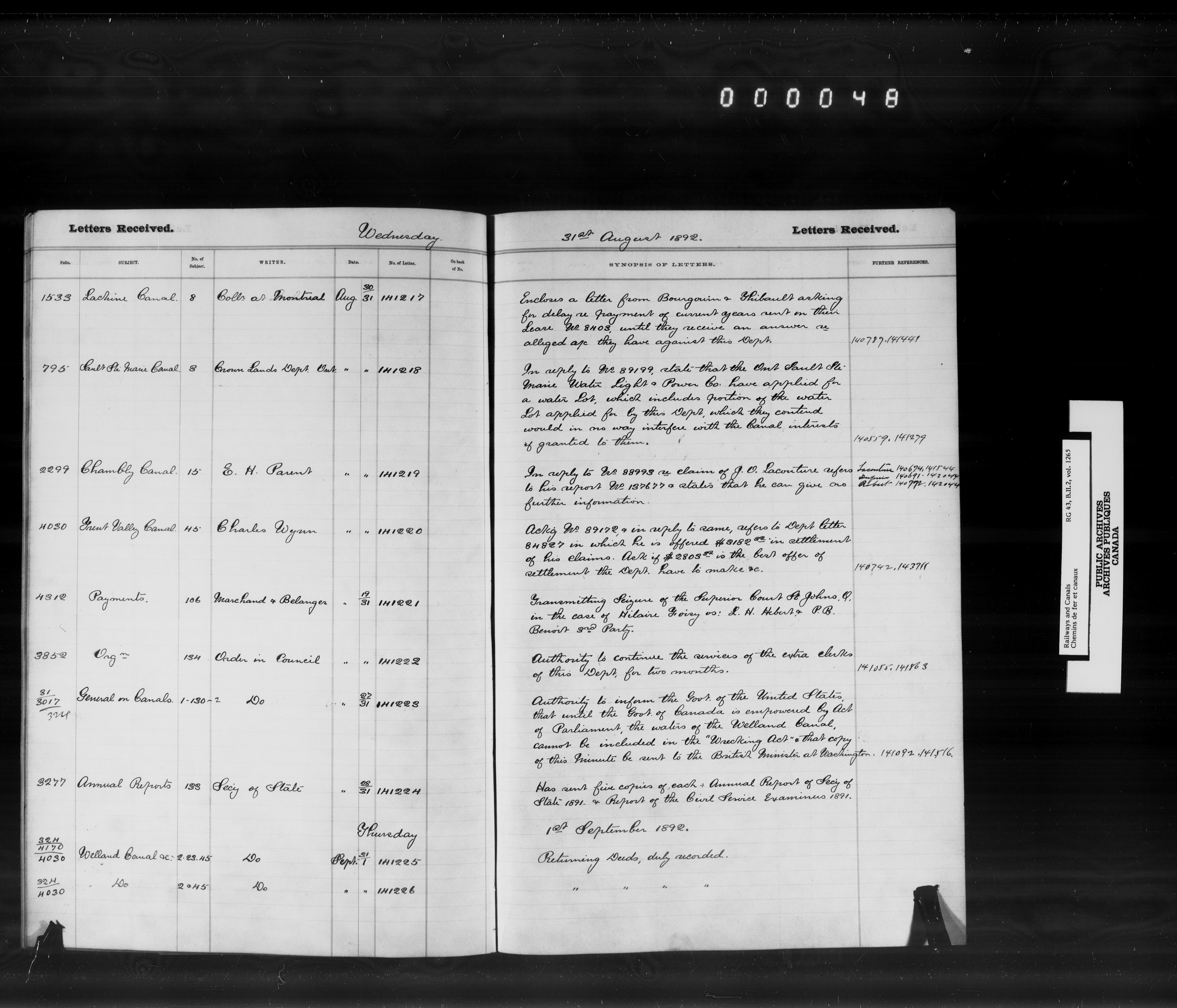 Department of Railways and Canals, Canal Branch : Registers of letters received between January 1881 and December 1892 - 7208