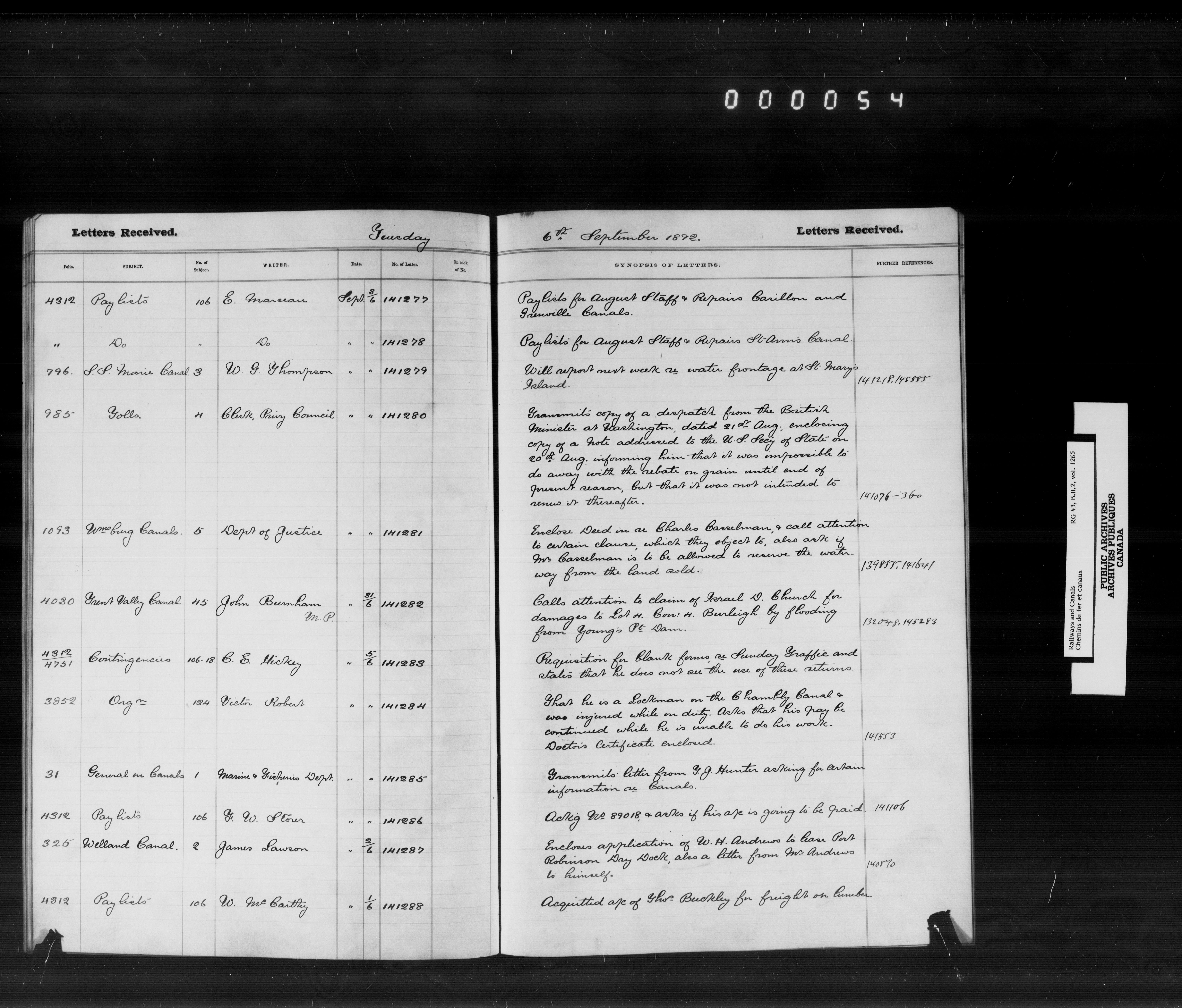Department of Railways and Canals, Canal Branch : Registers of letters received between January 1881 and December 1892 - 7208