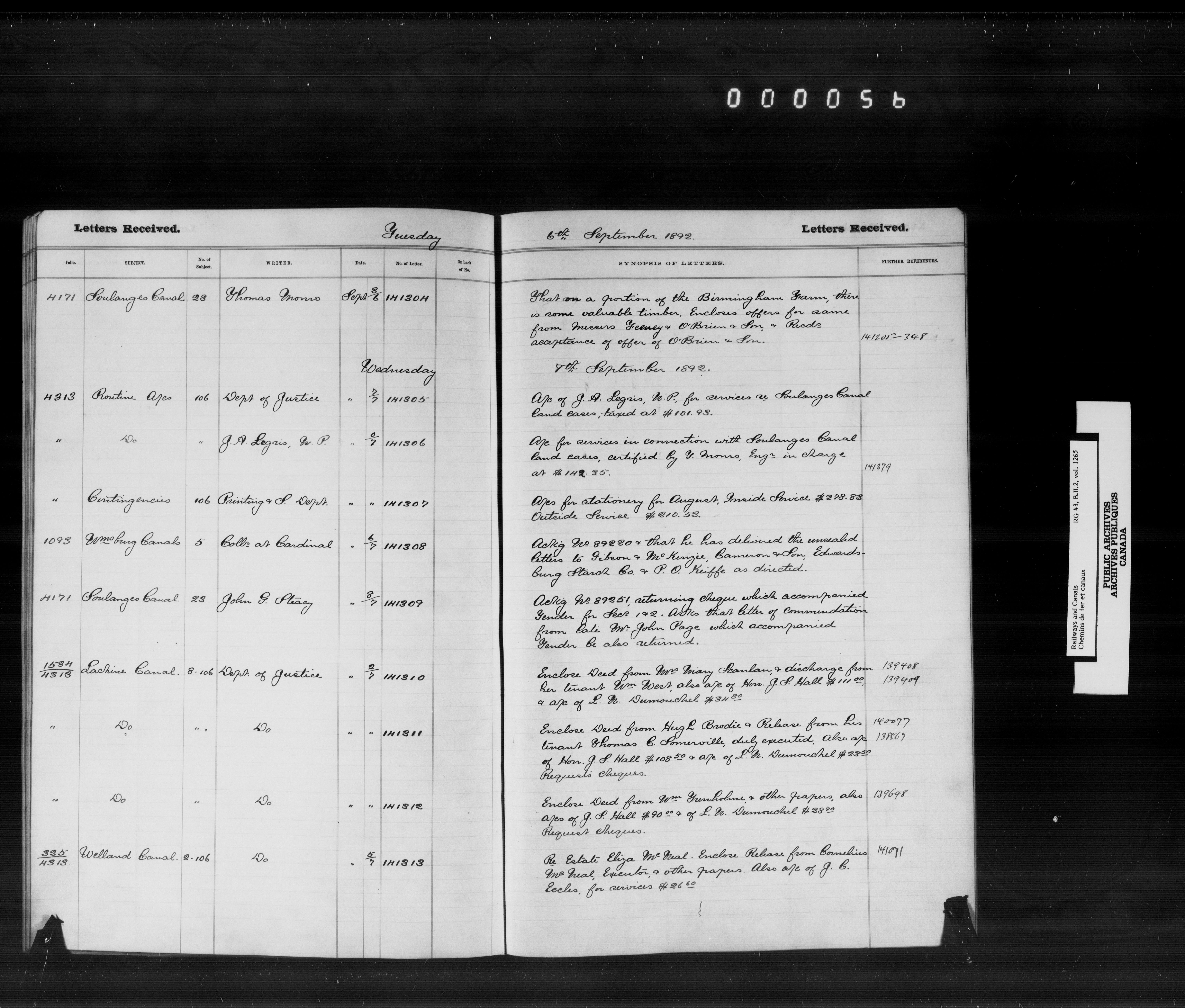 Department of Railways and Canals, Canal Branch : Registers of letters received between January 1881 and December 1892 - 7208