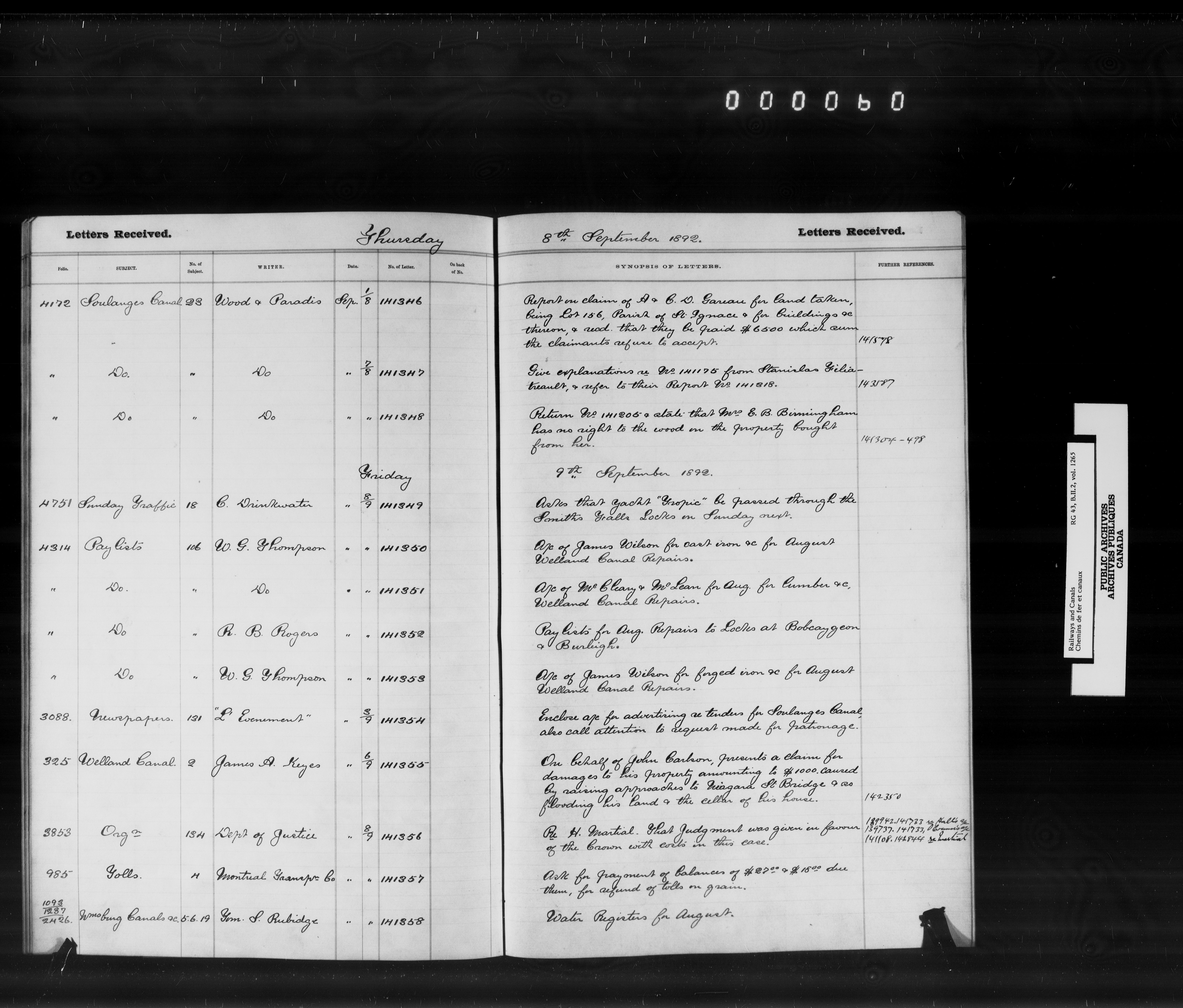 Department of Railways and Canals, Canal Branch : Registers of letters received between January 1881 and December 1892 - 7208