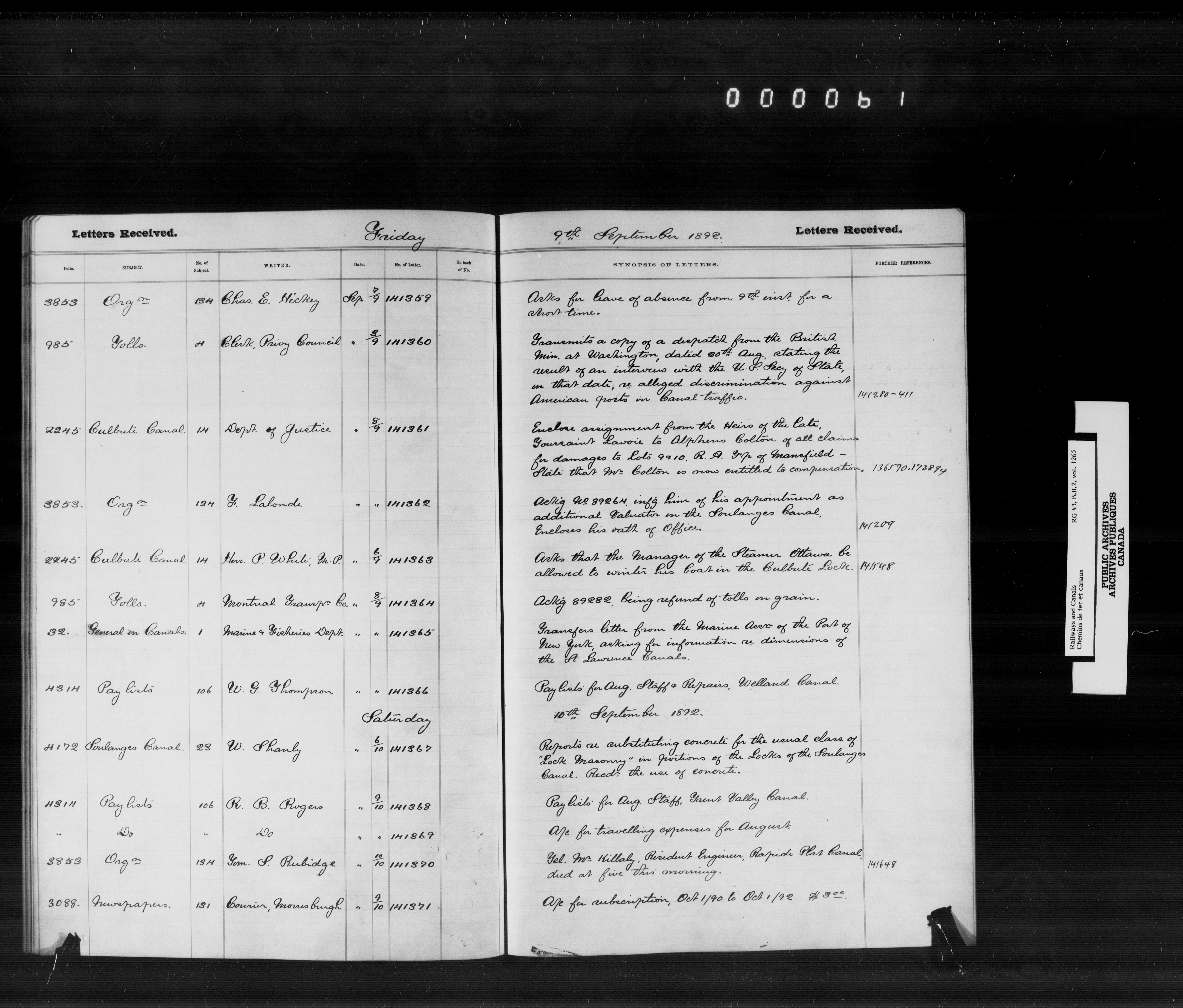 Department of Railways and Canals, Canal Branch : Registers of letters received between January 1881 and December 1892 - 7208
