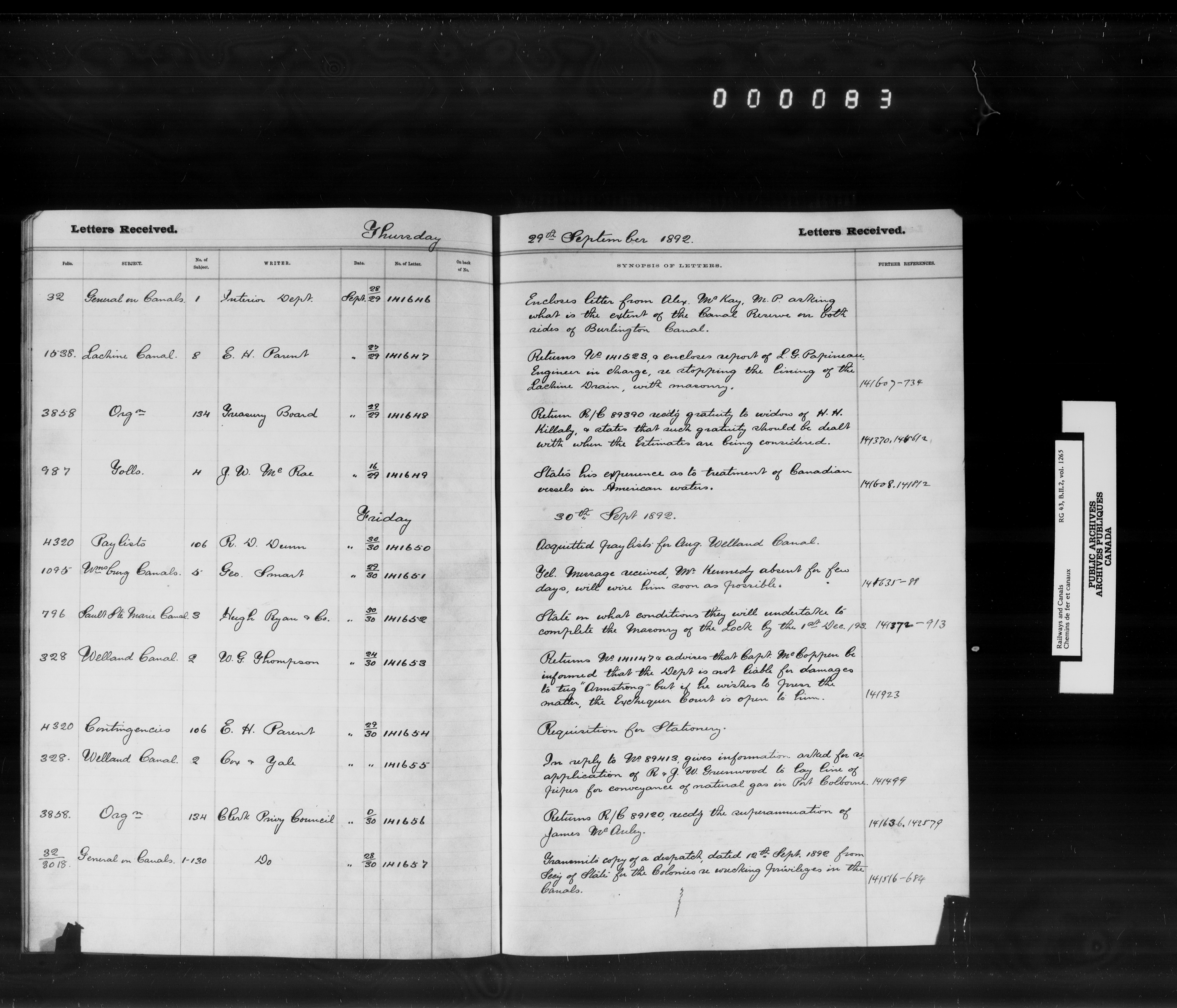 Department of Railways and Canals, Canal Branch : Registers of letters received between January 1881 and December 1892 - 7208