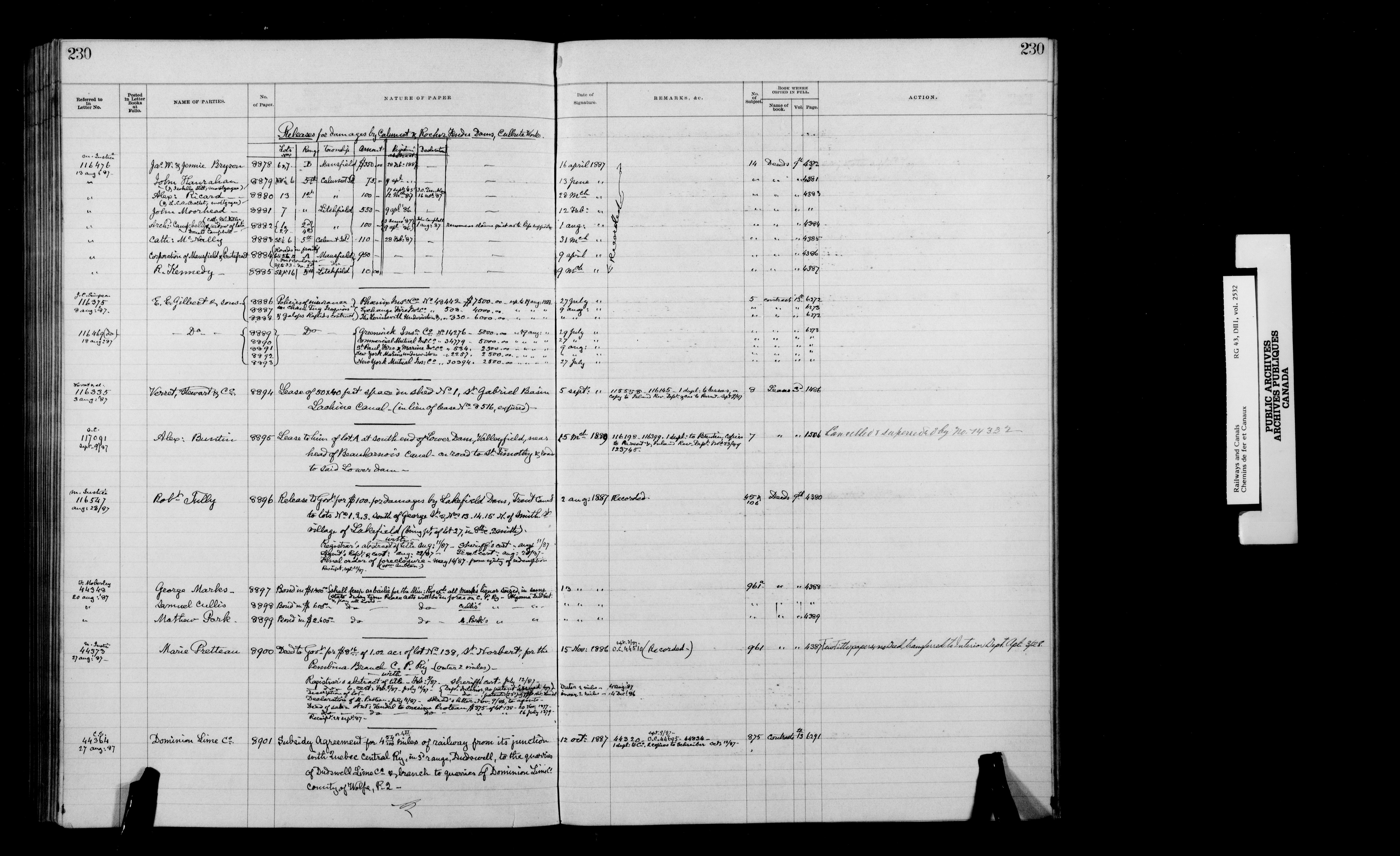 Department of Railways and Canals, Legal records : General and subject indexes, contract and agreement registers, and references to the Exchequer Court. - 7216