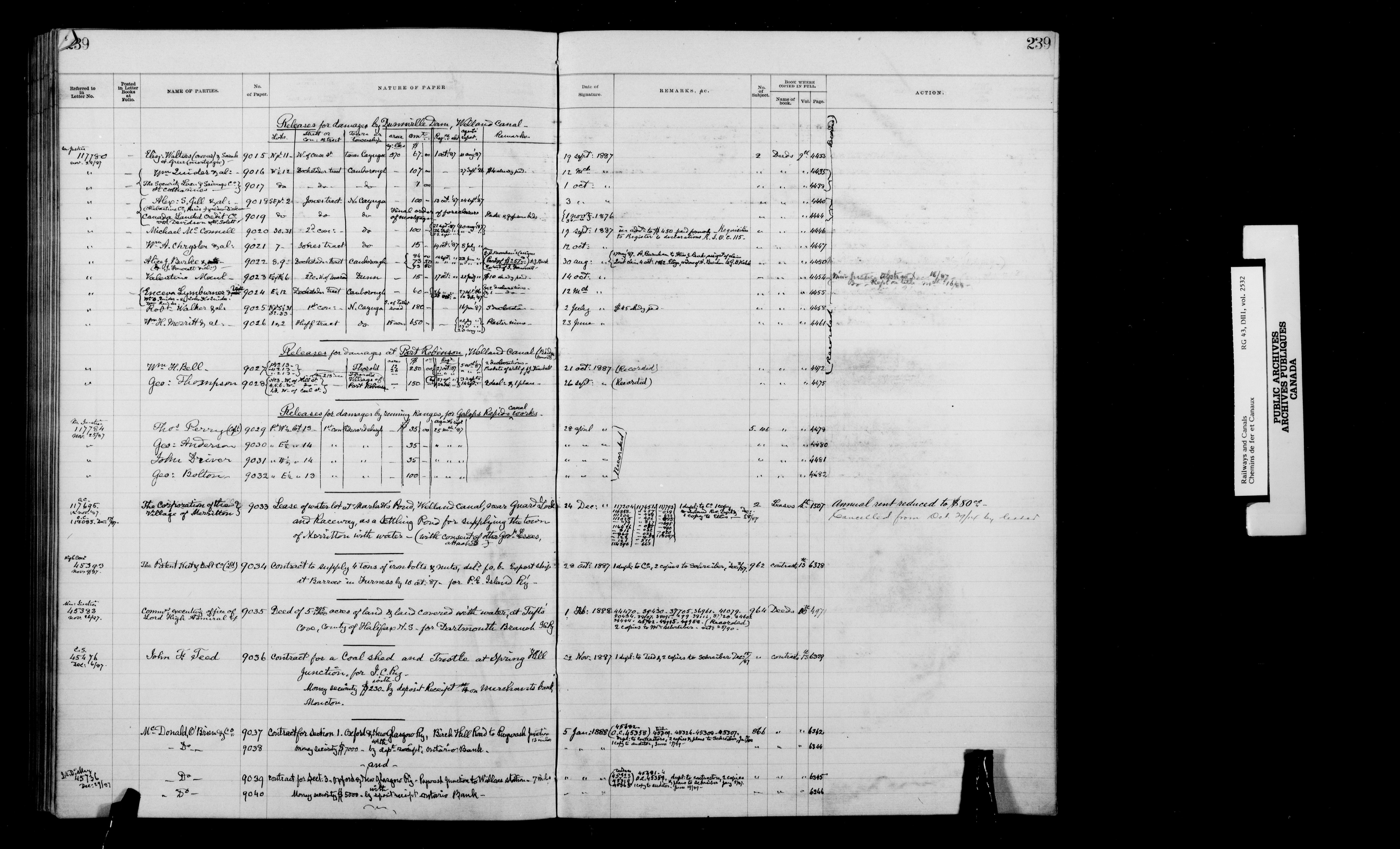 Department of Railways and Canals, Legal records : General and subject indexes, contract and agreement registers, and references to the Exchequer Court. - 7216