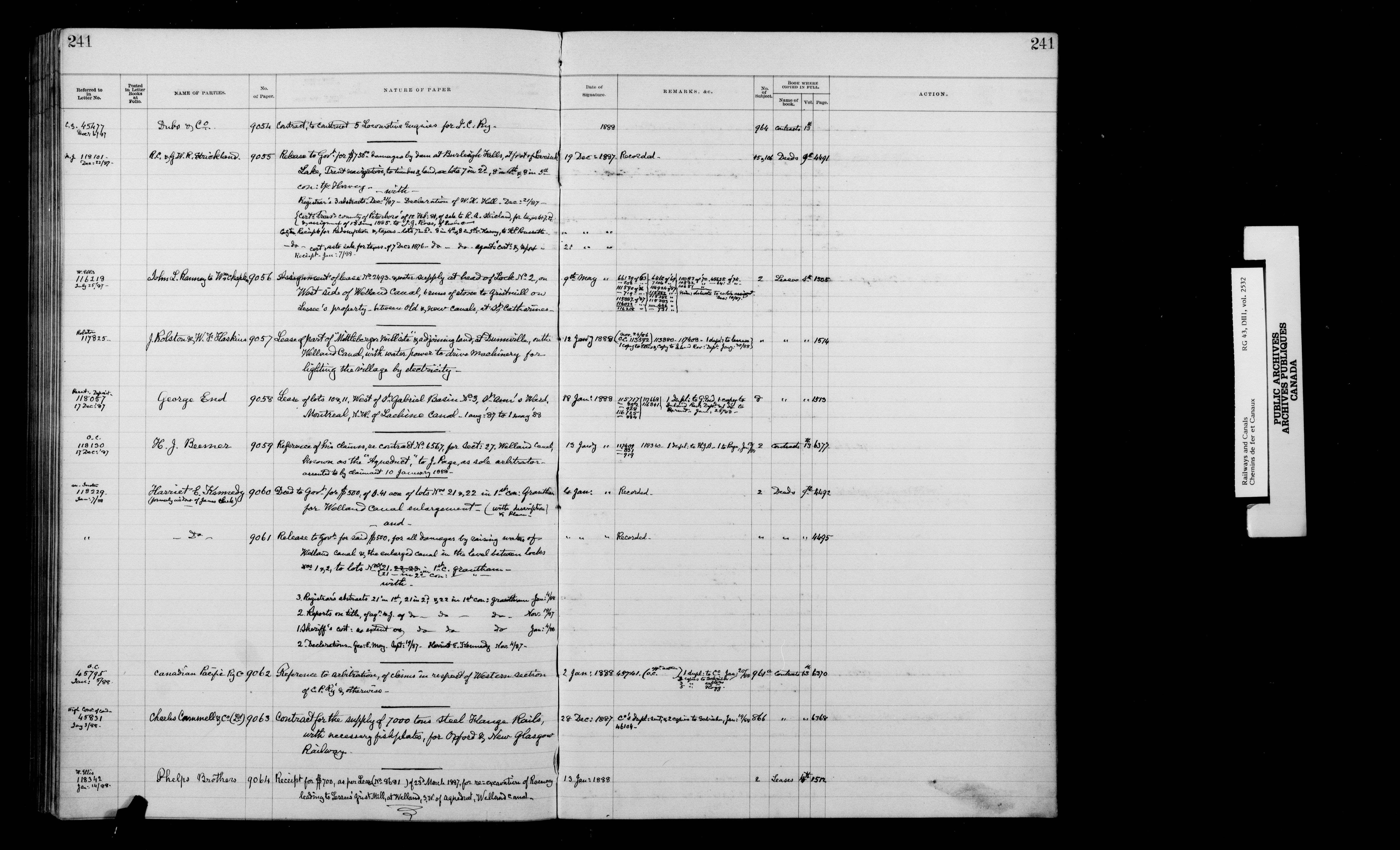Department of Railways and Canals, Legal records : General and subject indexes, contract and agreement registers, and references to the Exchequer Court. - 7216