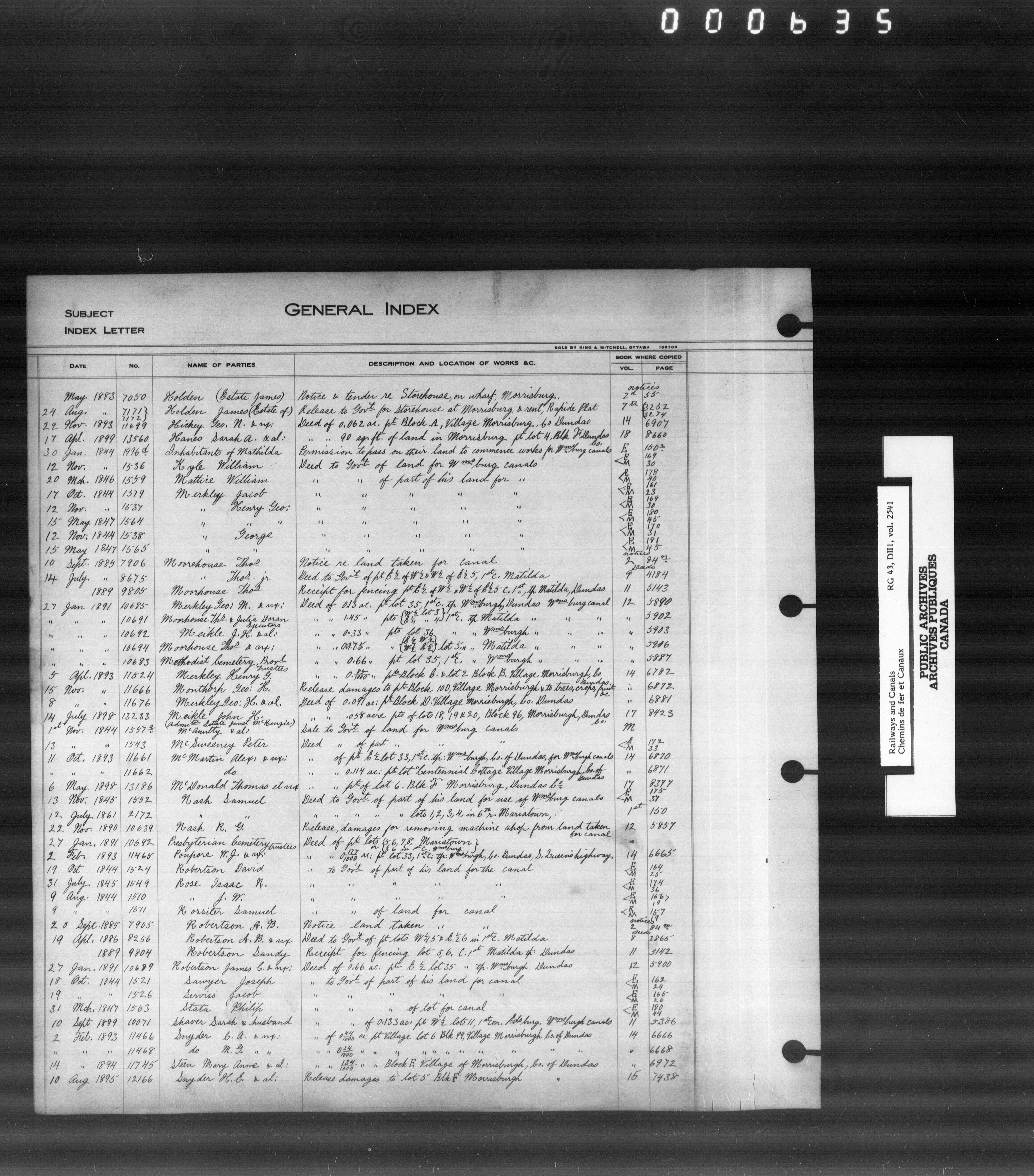 Department of Railways and Canals, Legal records : General and subject indexes, contract and agreement registers, and references to the Exchequer Court. - 7218