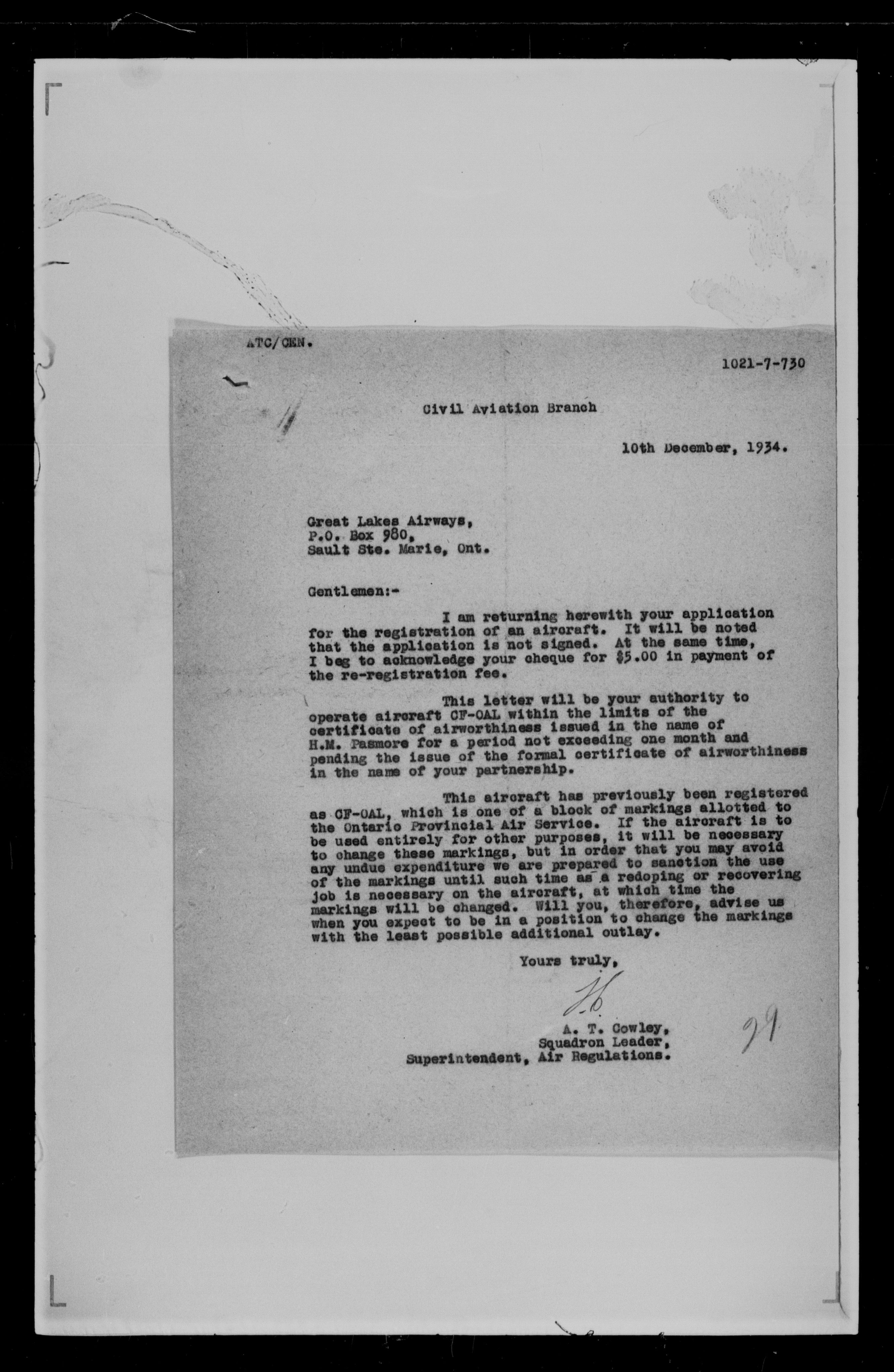 Department of Transport : Civil aircraft registration, inspection and operation files, block 5008, 1920-1986 - 7245