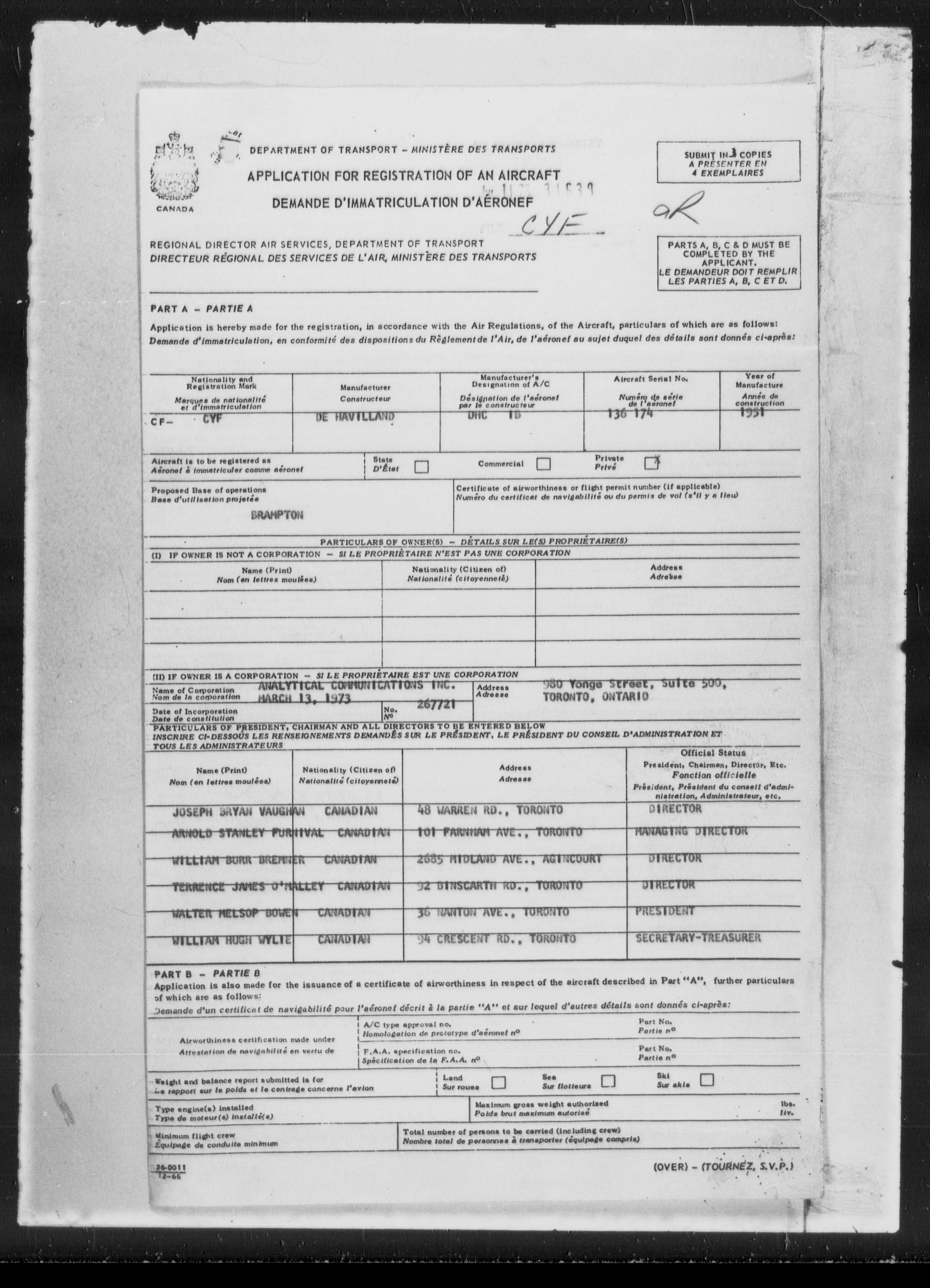 Department of Transport : Civil aircraft registration, inspection and operation files, 1920-1986 : T-7300