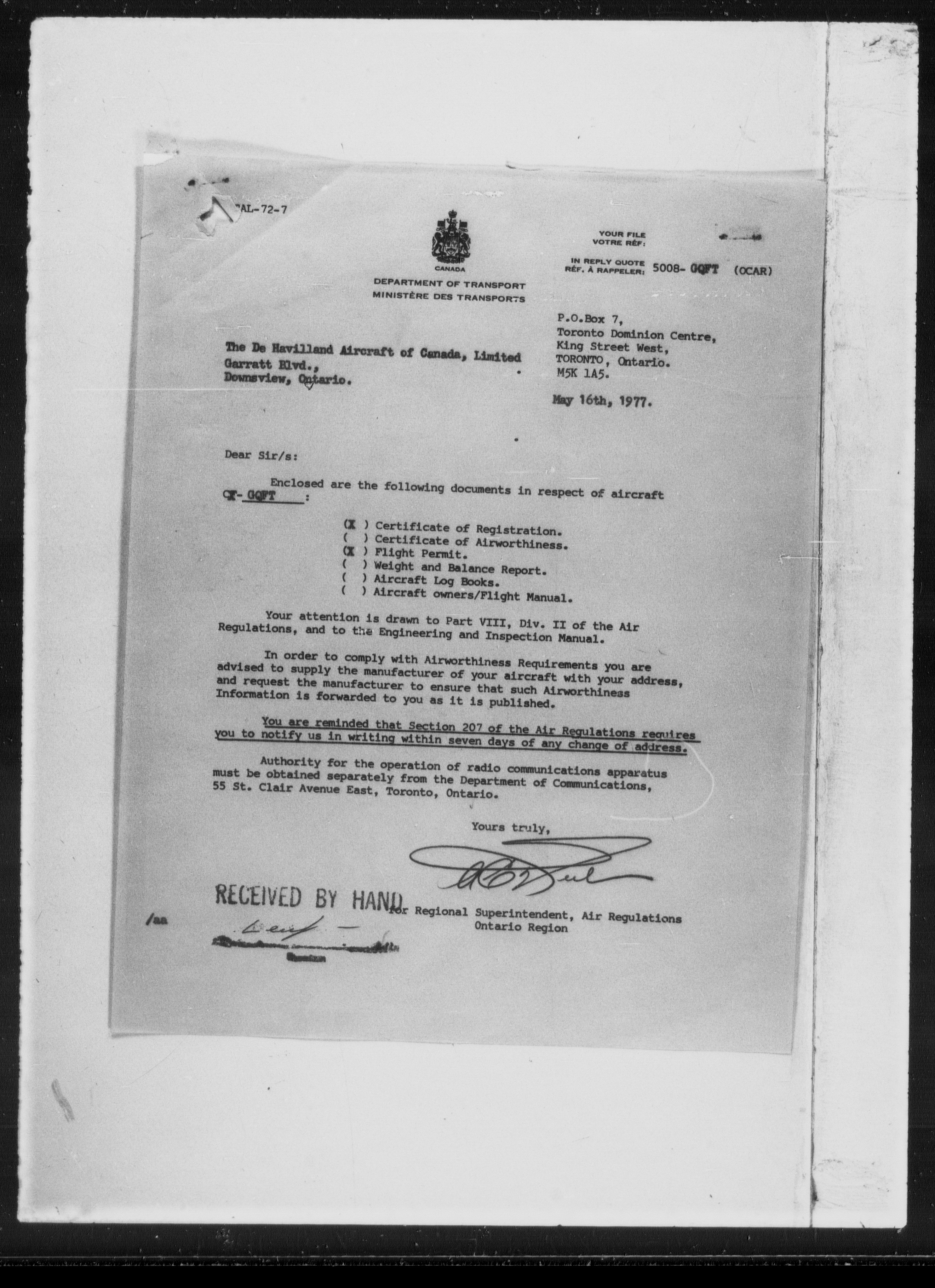 Department of Transport : Civil aircraft registration, inspection and operation files, block 5008, 1920-1986 - 7300