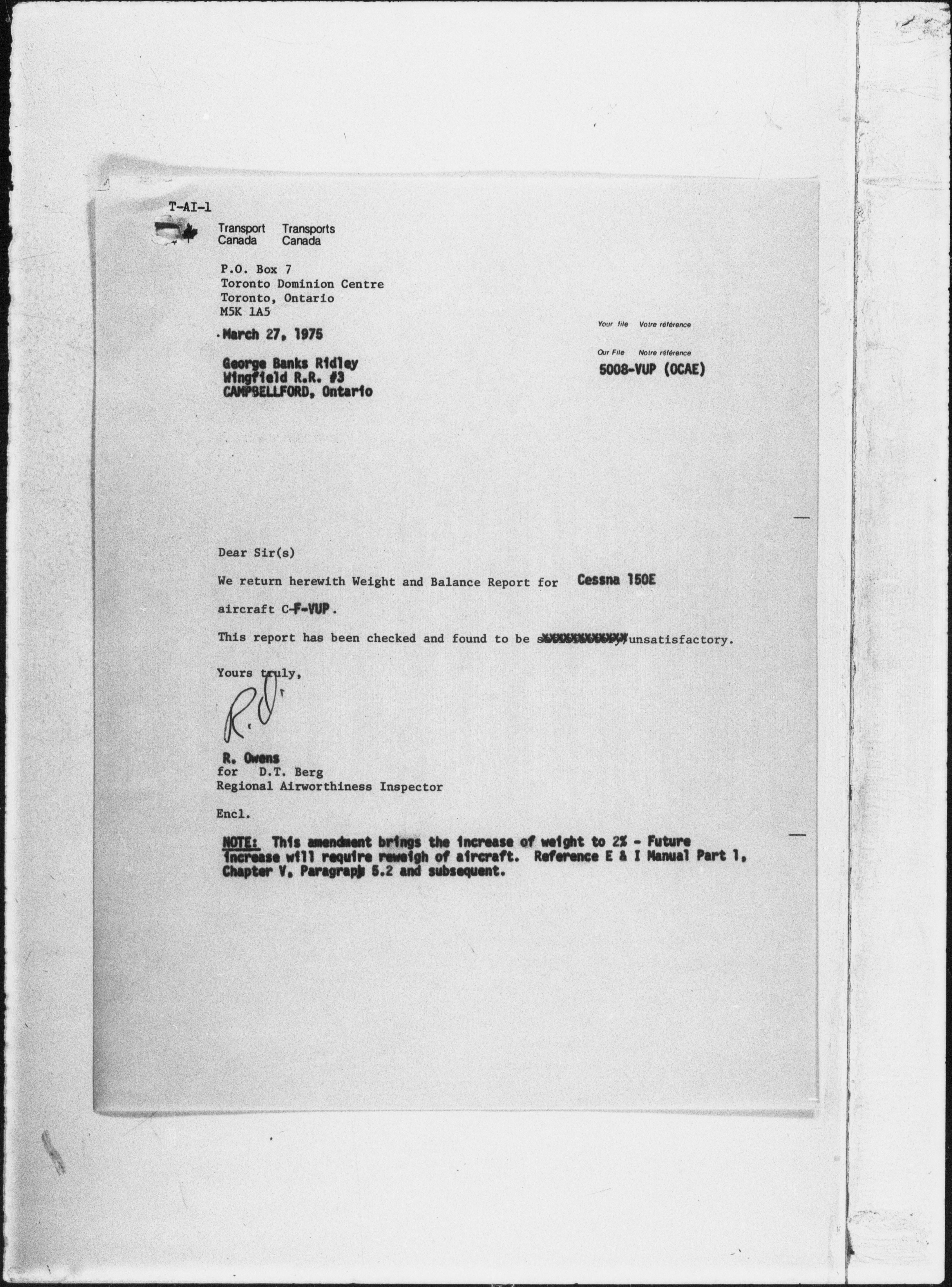 Department of Transport : Civil aircraft registration, inspection and operation files, 1920-1986 : T-7308
