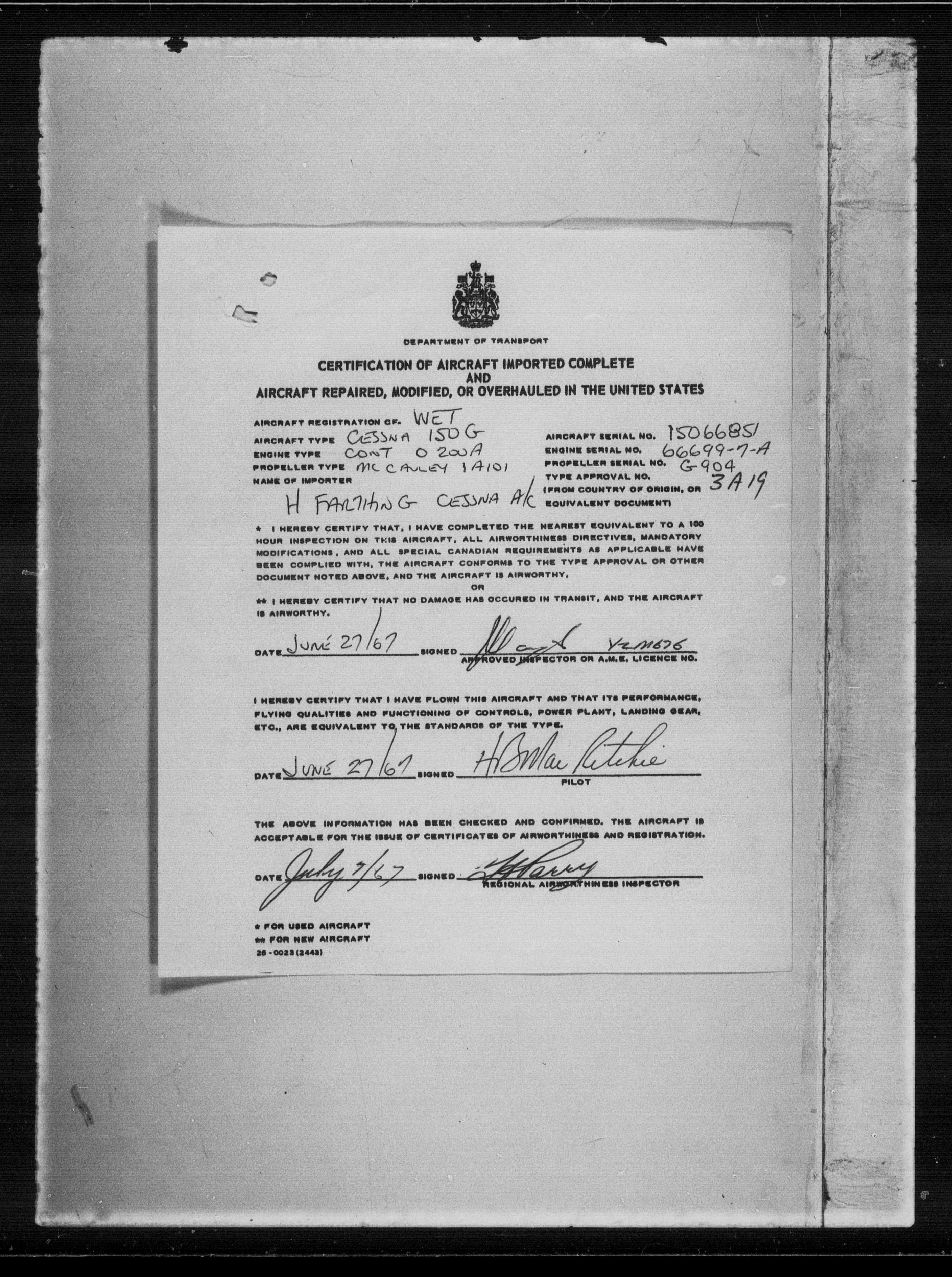 Department of Transport : Civil aircraft registration, inspection and operation files, block 5008, 1920-1986 - 7309