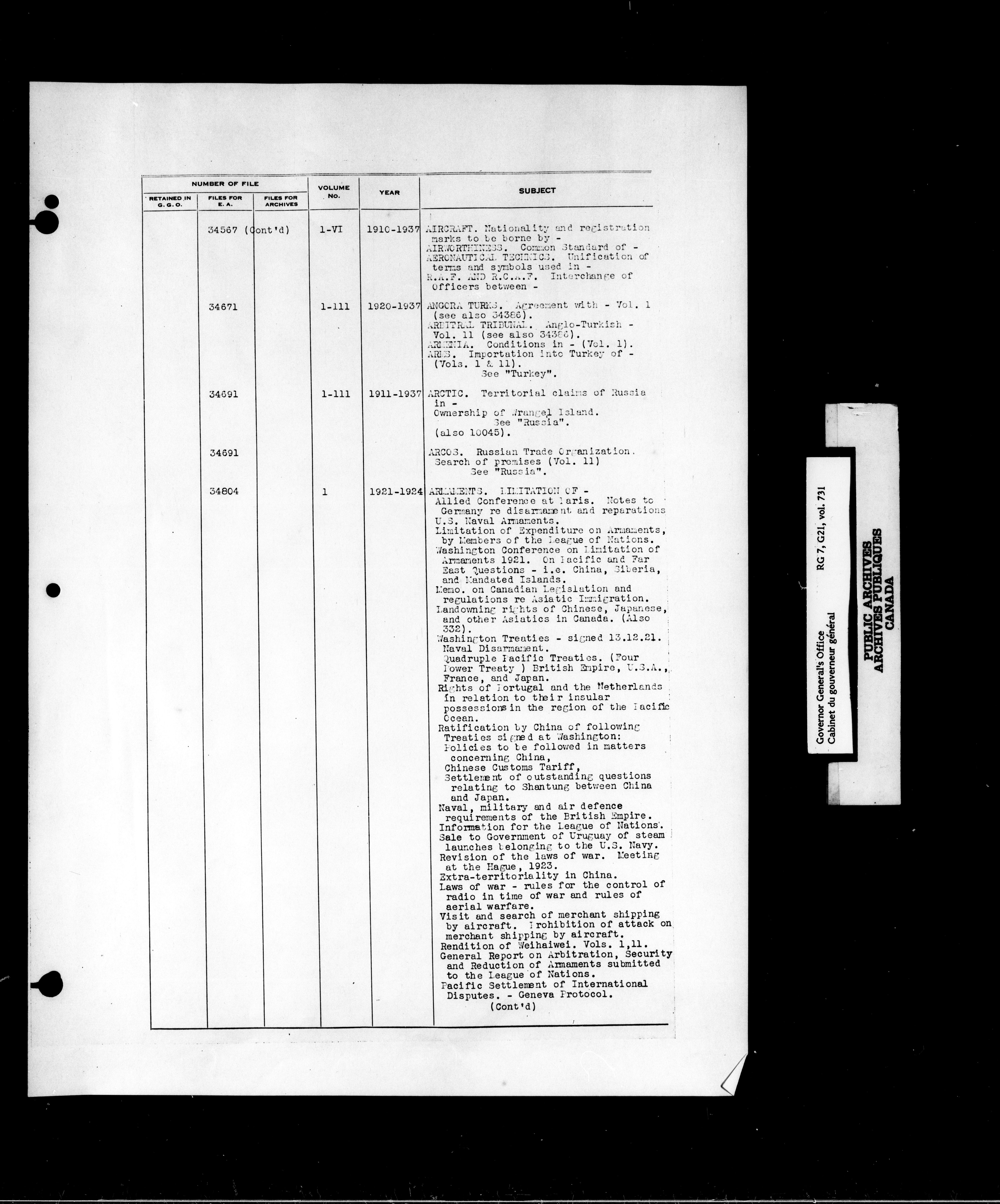 Index to Governor General numbered files - T-7327