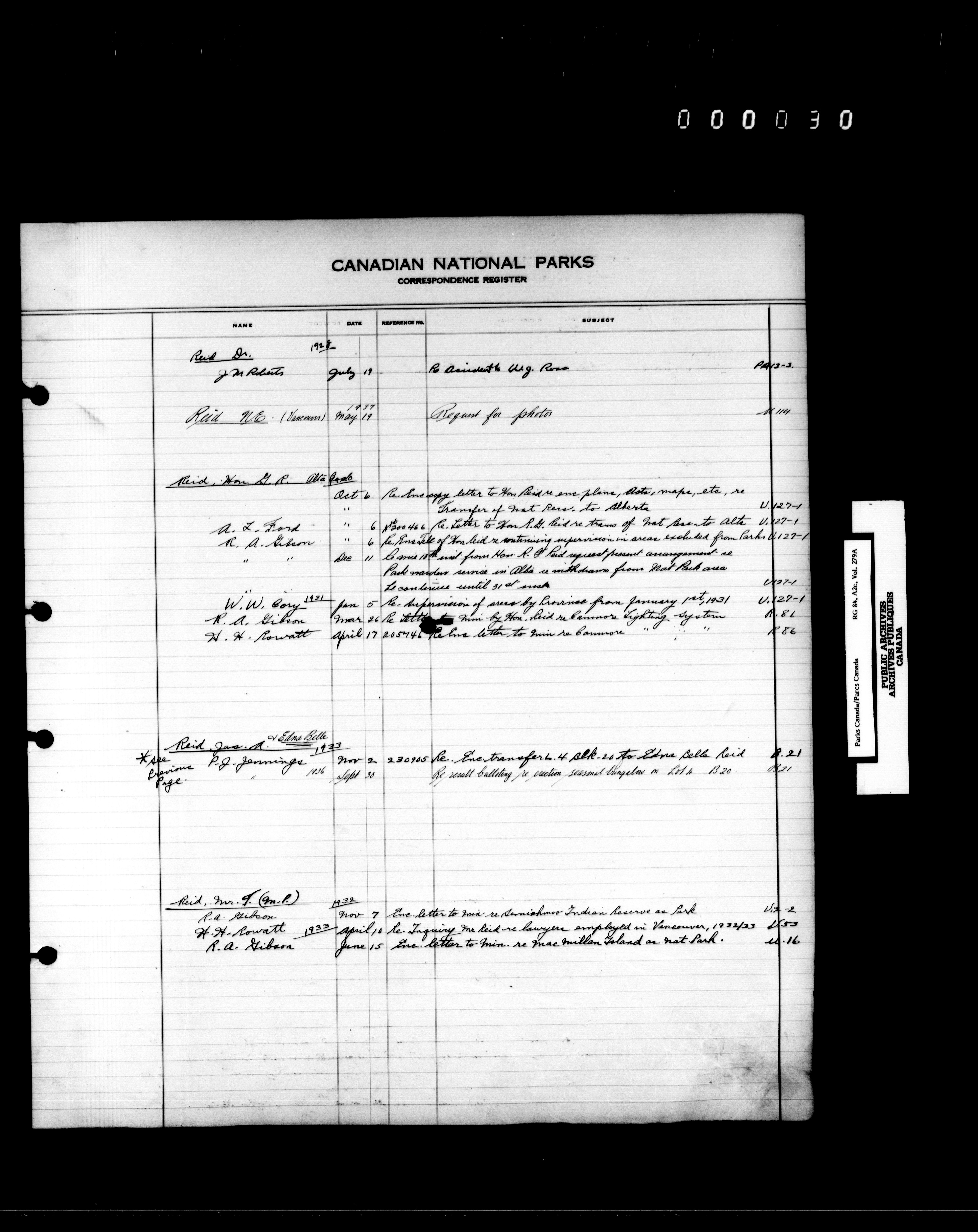 Dominion Parks Branch central registry system : Correspondence registers covering the remaining years of the Dominion Parks Branch in the old Department of the Interior, 1919-1937 - 7347