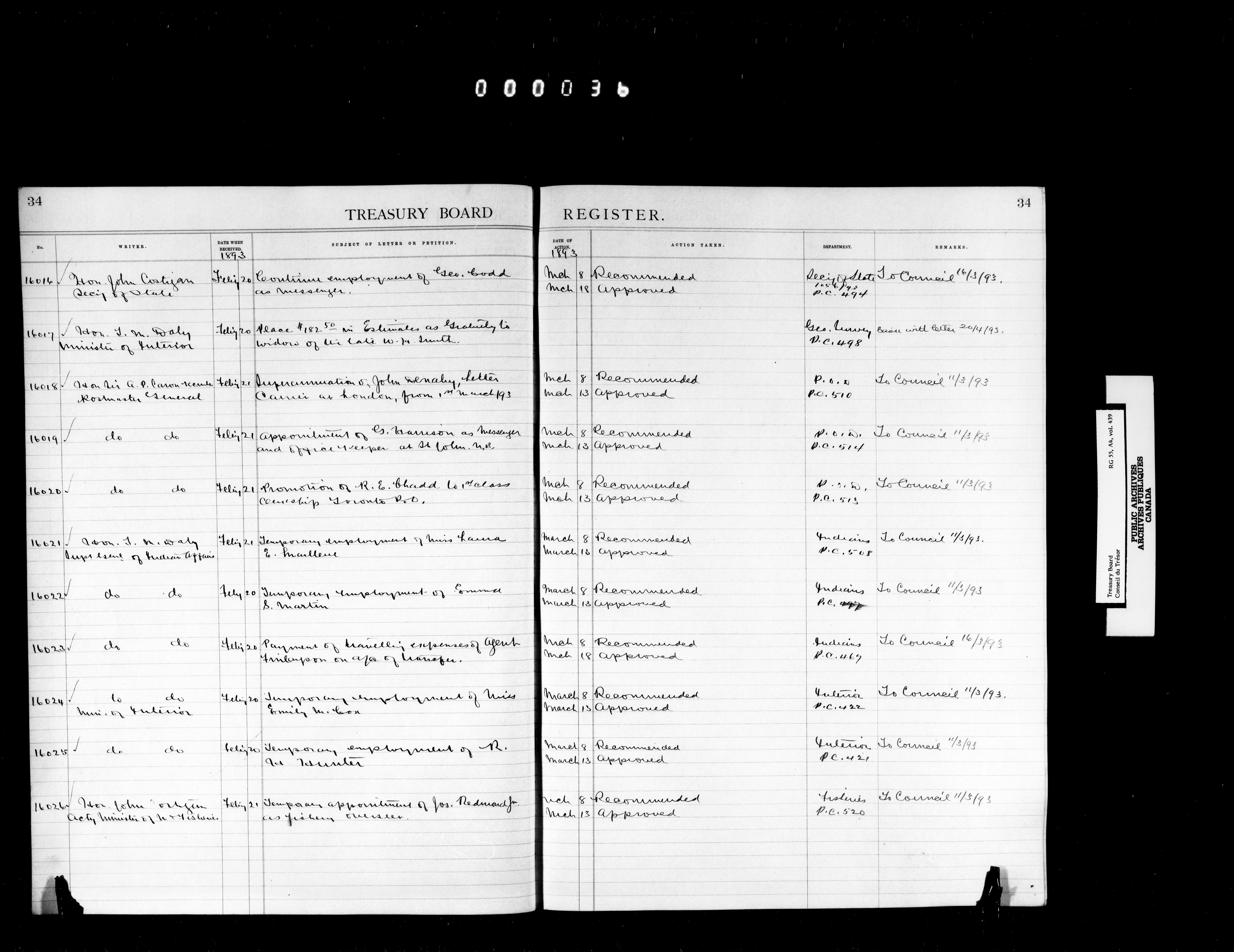 Treasury Board (Committee of the Privy Council) : indexes and registers, 1886-1995 - 7385