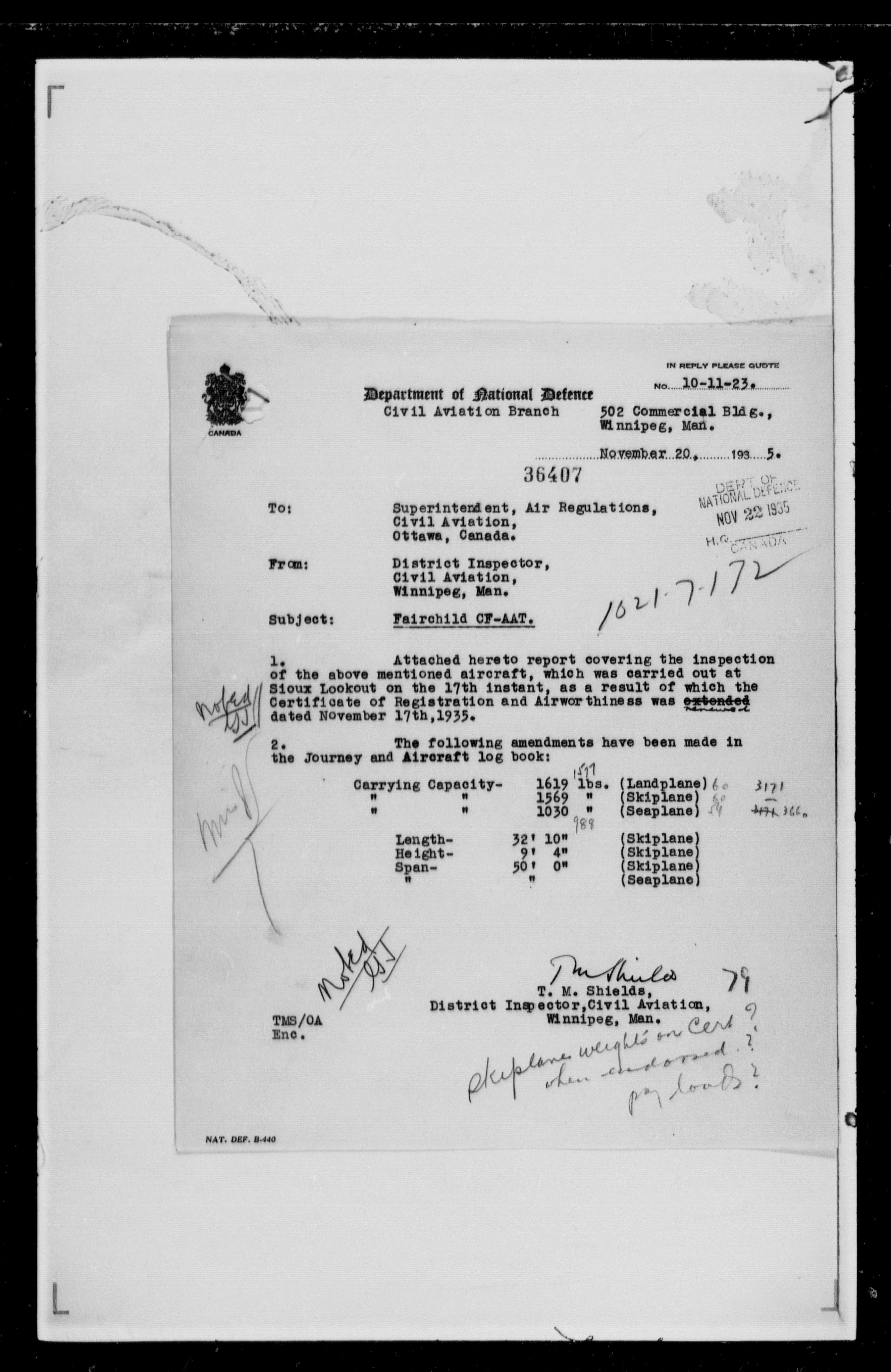 Department of Transport : Civil aircraft registration, inspection and operation files, block 5008, 1920-1986 - 7417