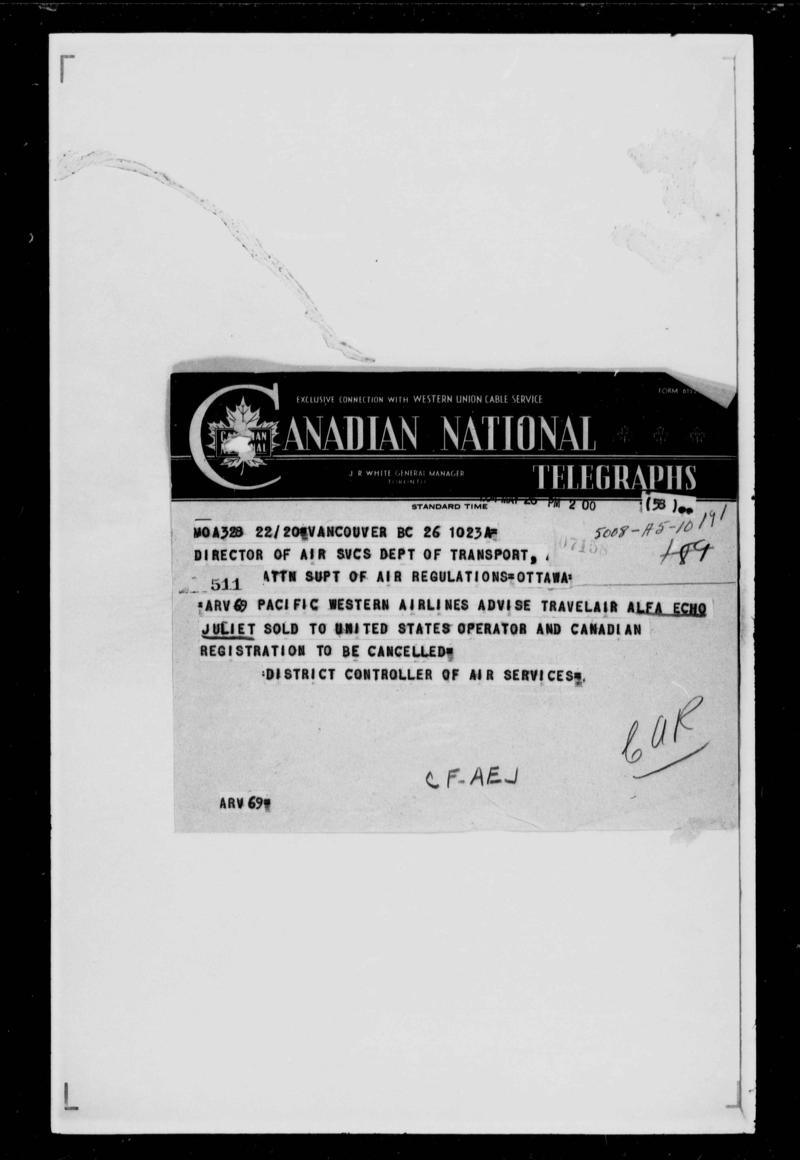 Department of Transport : Civil aircraft registration, inspection and operation files, block 5008, 1920-1986 - 7421