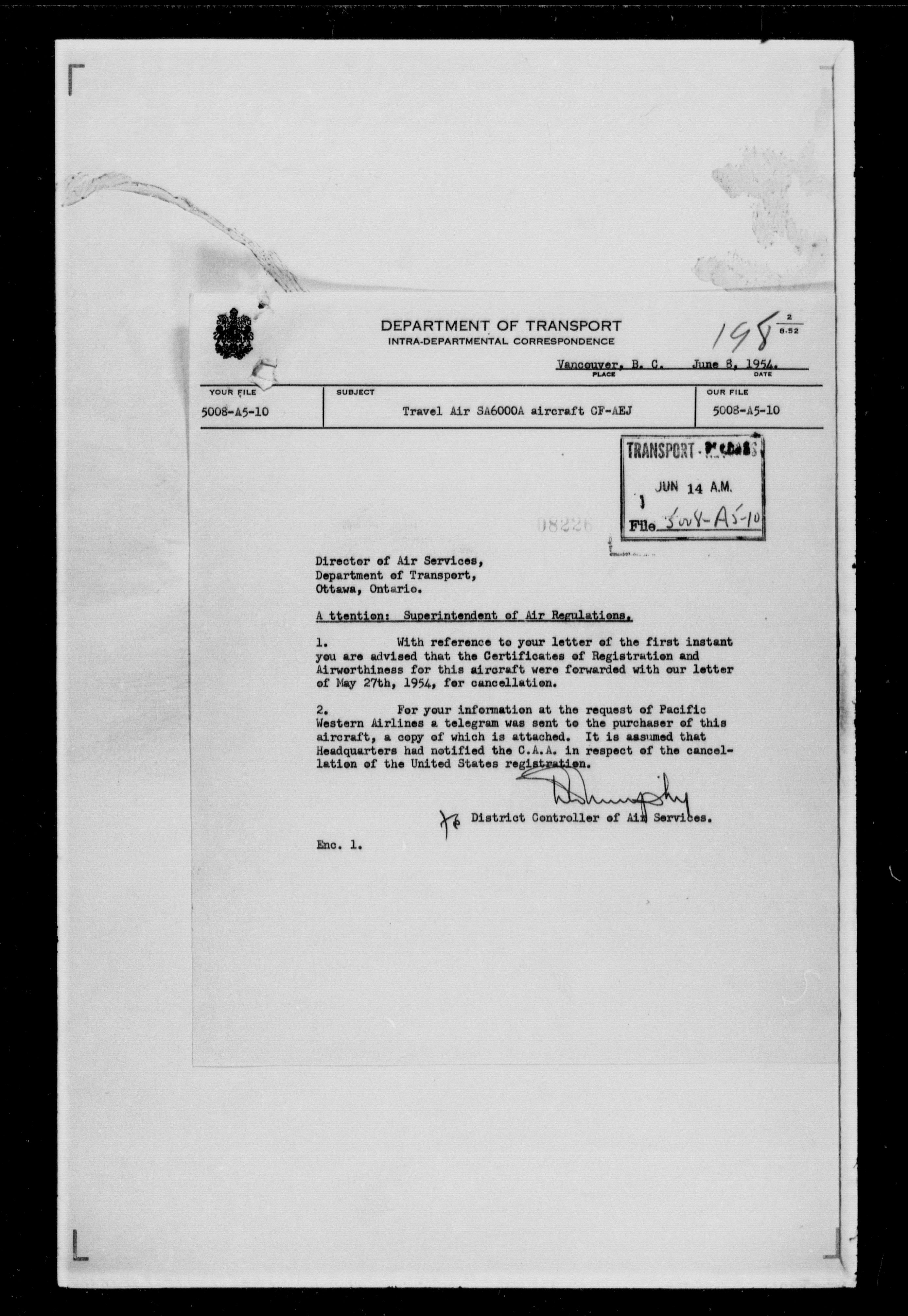 Department of Transport : Civil aircraft registration, inspection and operation files, block 5008, 1920-1986 - 7421
