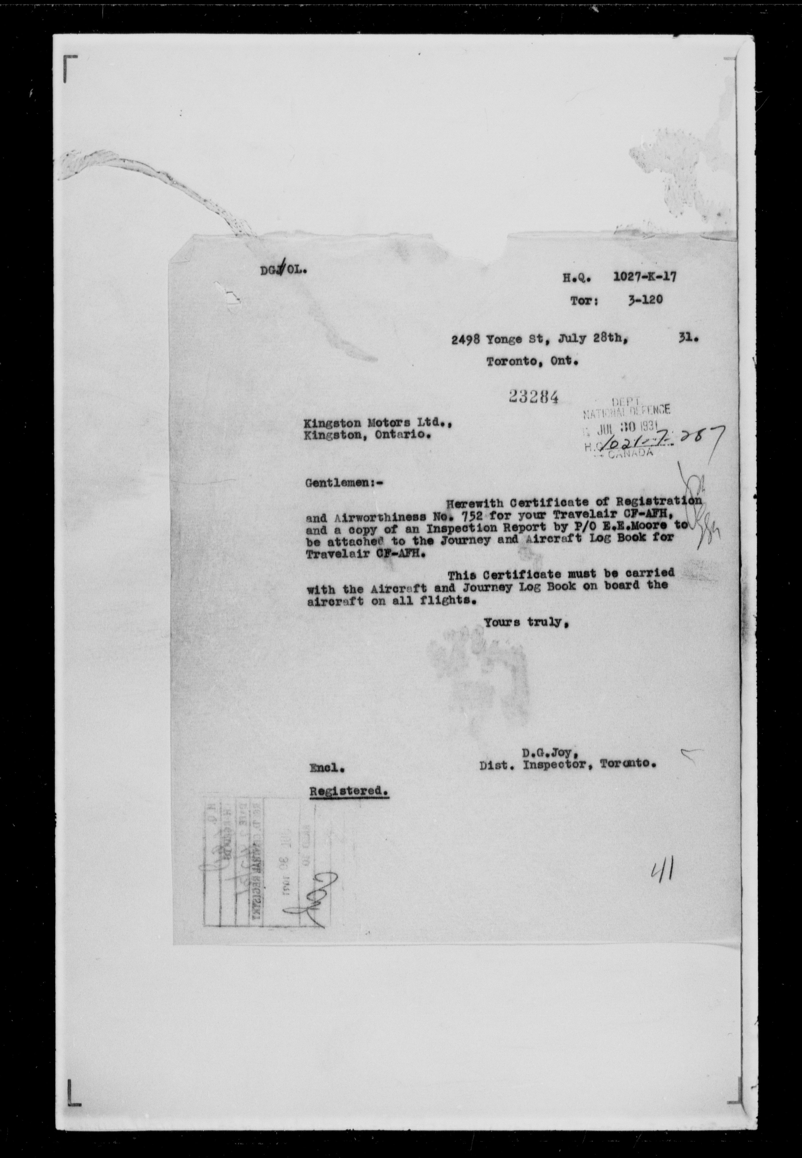 Department of Transport : Civil aircraft registration, inspection and operation files, block 5008, 1920-1986 - 7423