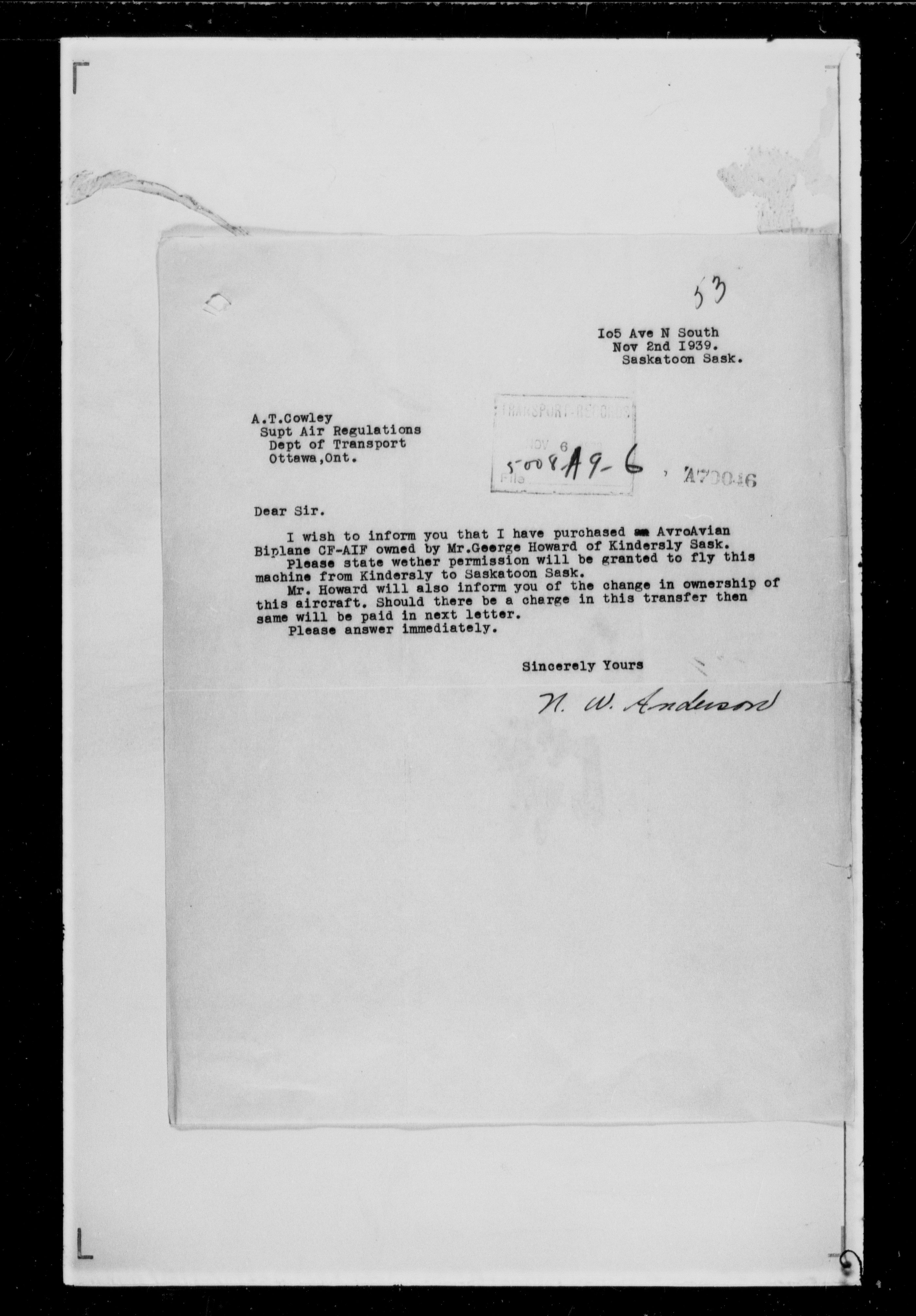 Department of Transport : Civil aircraft registration, inspection and operation files, block 5008, 1920-1986 - 7426