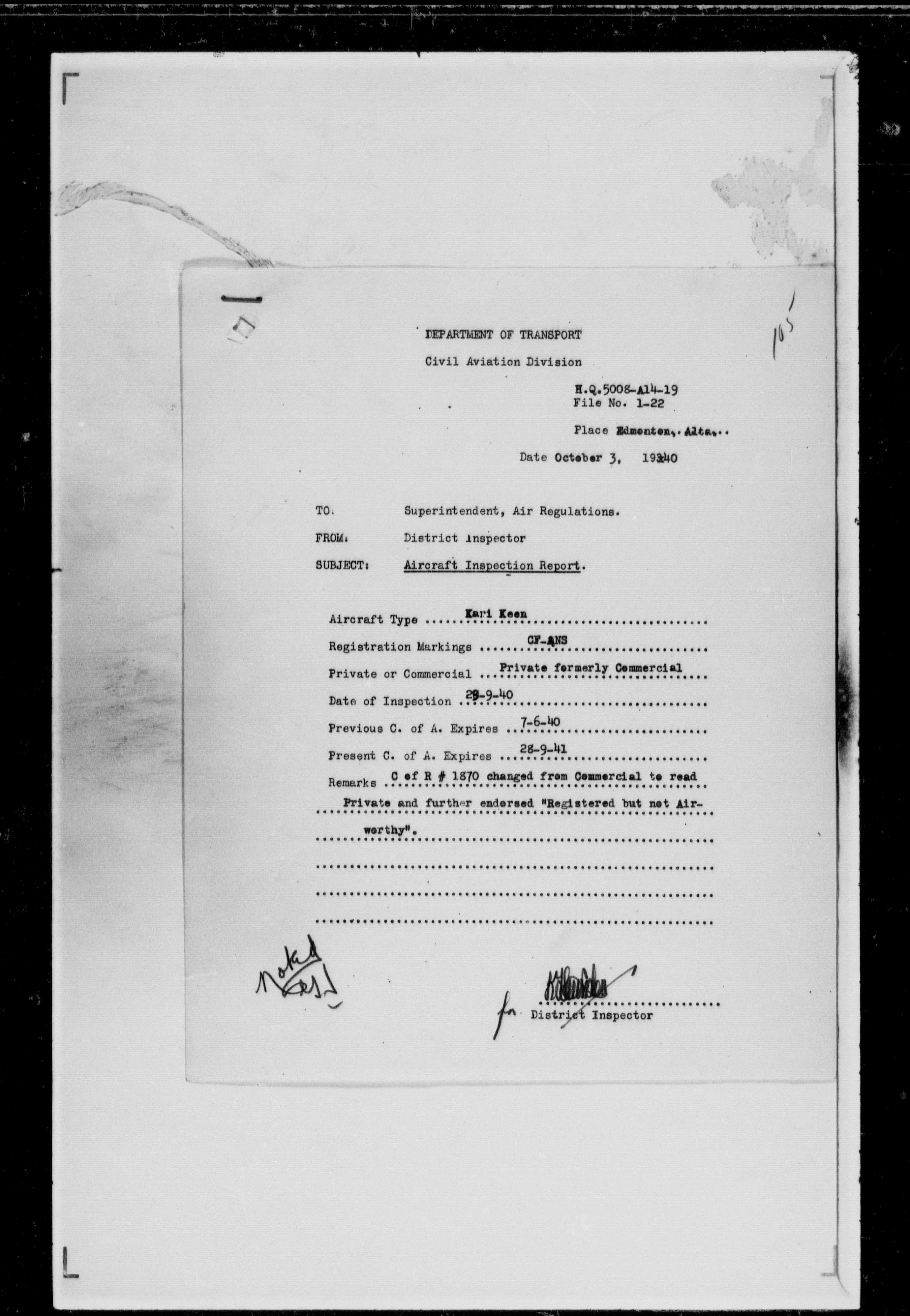 Department of Transport : Civil aircraft registration, inspection and operation files, block 5008, 1920-1986 - 7431