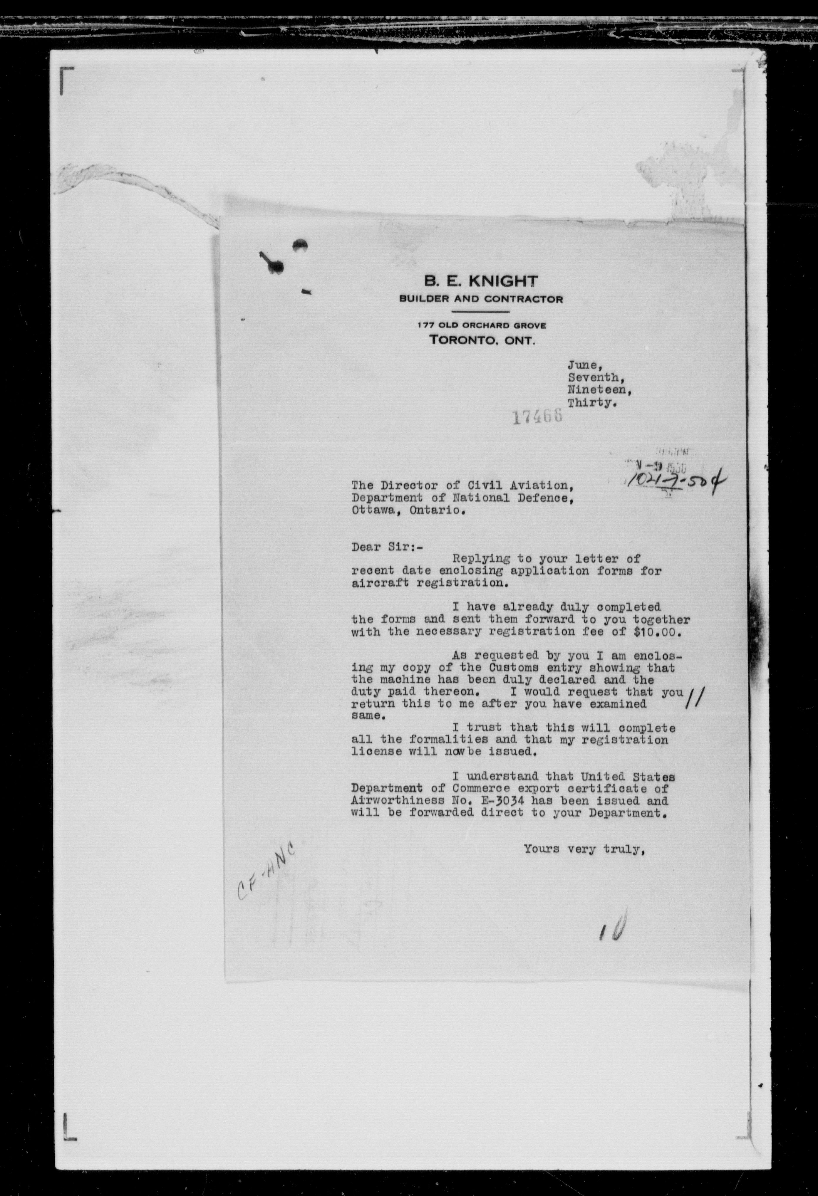Department of Transport : Civil aircraft registration, inspection and operation files, block 5008, 1920-1986 - 7431