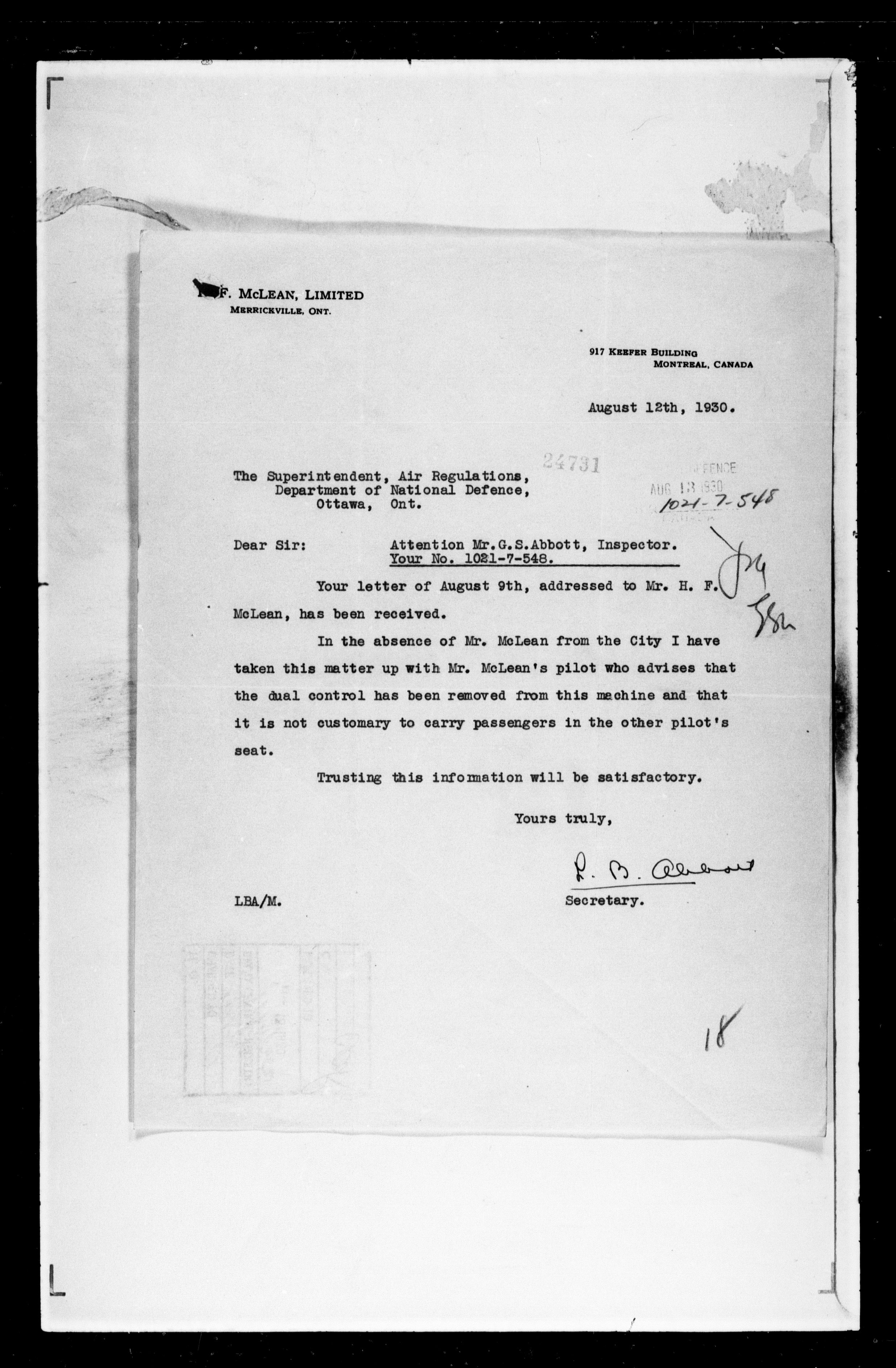 Department of Transport : Civil aircraft registration, inspection and operation files, 1920-1986 : T-7432