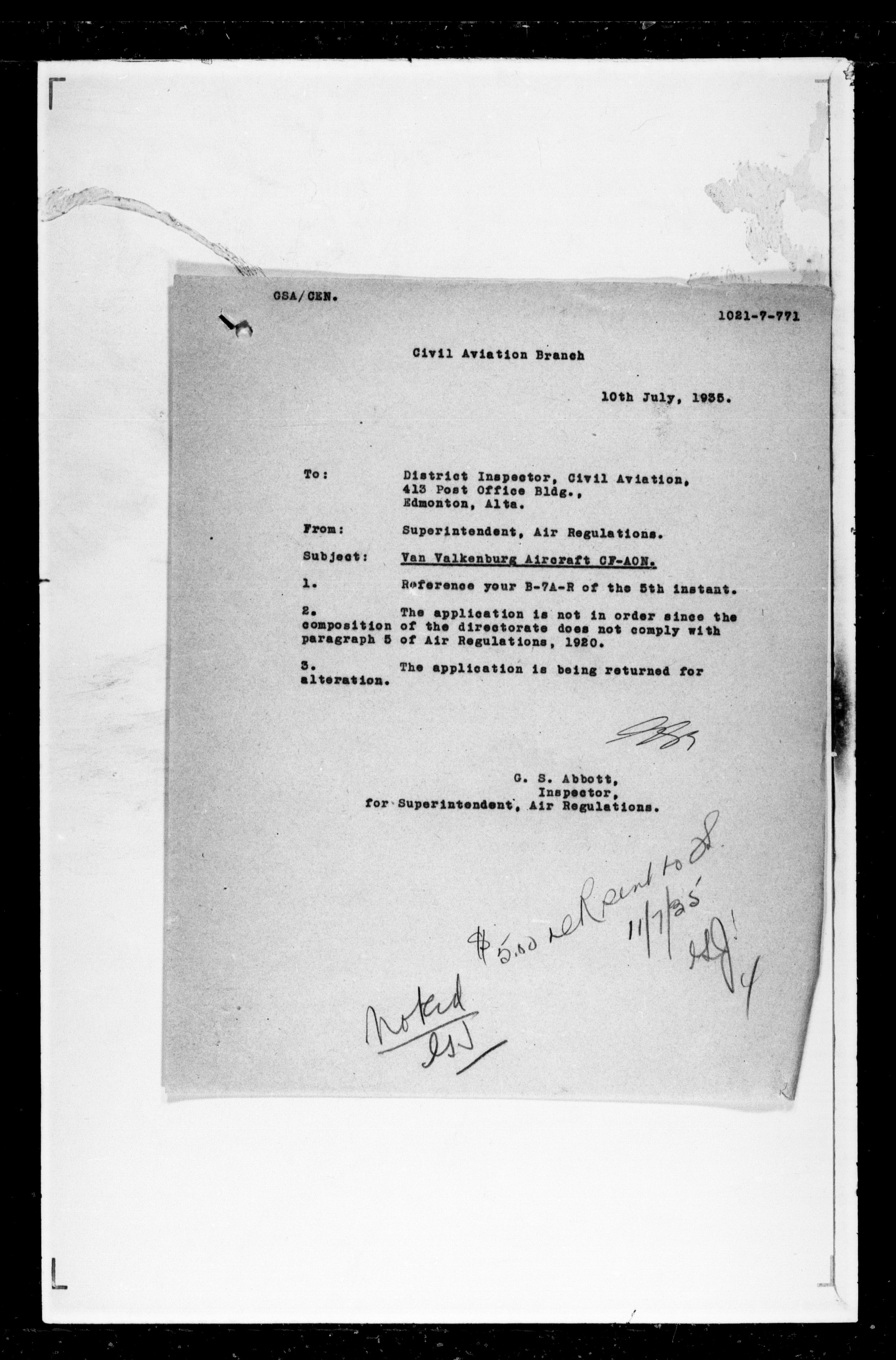 Department of Transport : Civil aircraft registration, inspection and operation files, block 5008, 1920-1986 - 7433