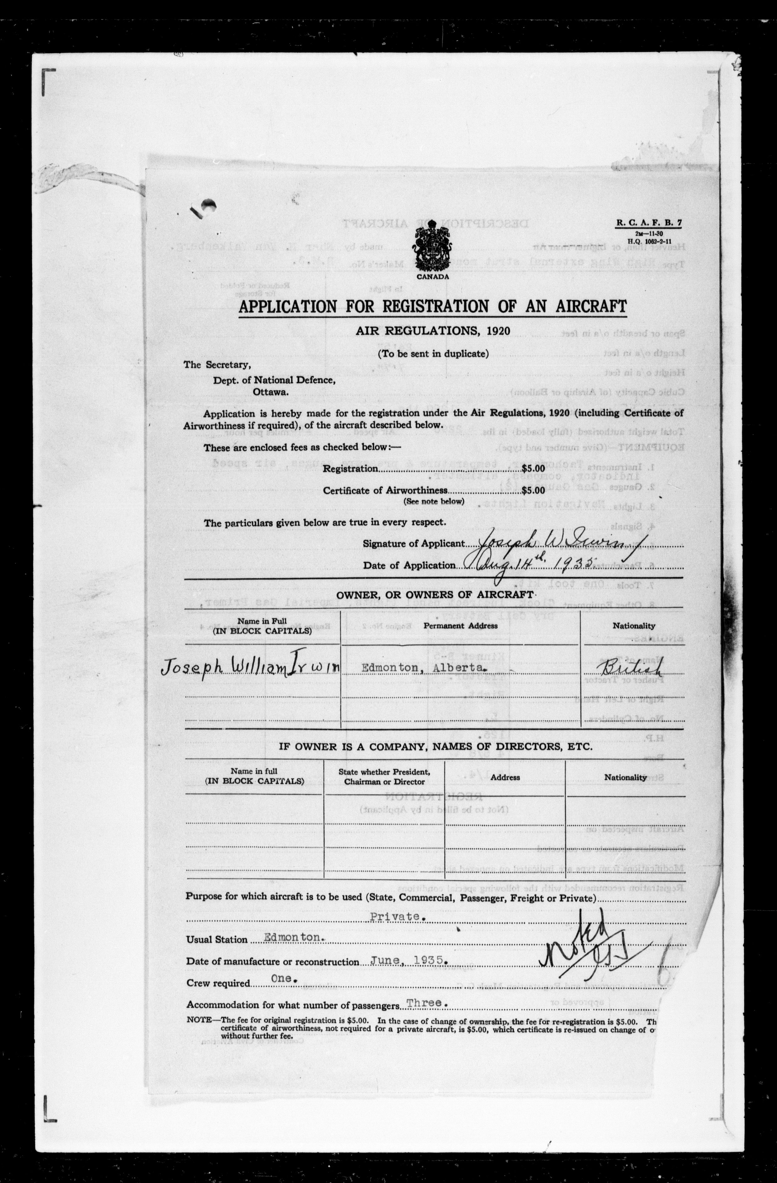 Department of Transport : Civil aircraft registration, inspection and operation files, block 5008, 1920-1986 - 7433
