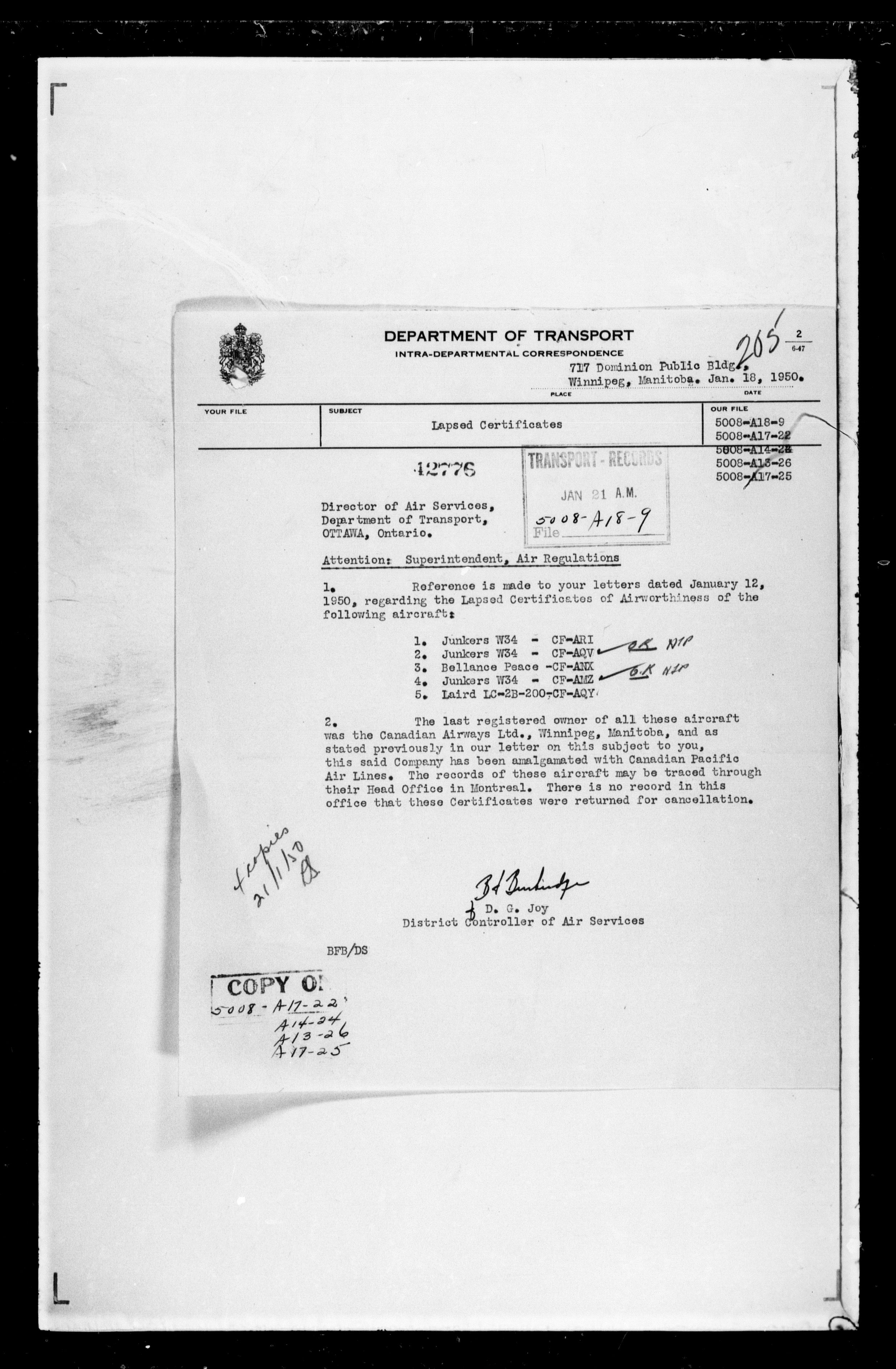 Department of Transport : Civil aircraft registration, inspection and operation files, block 5008, 1920-1986 - 7436