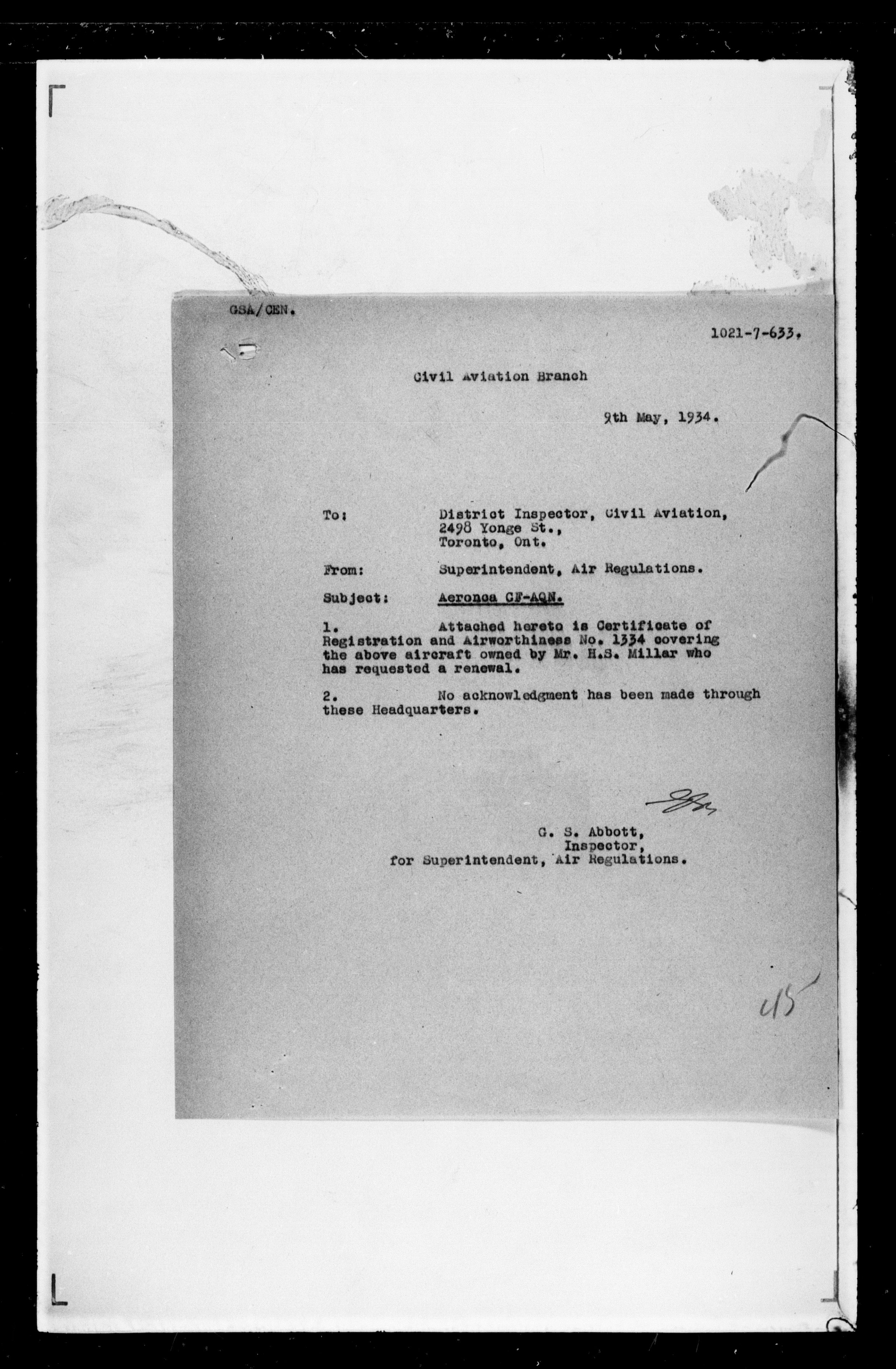 Department of Transport : Civil aircraft registration, inspection and operation files, block 5008, 1920-1986 - 7436