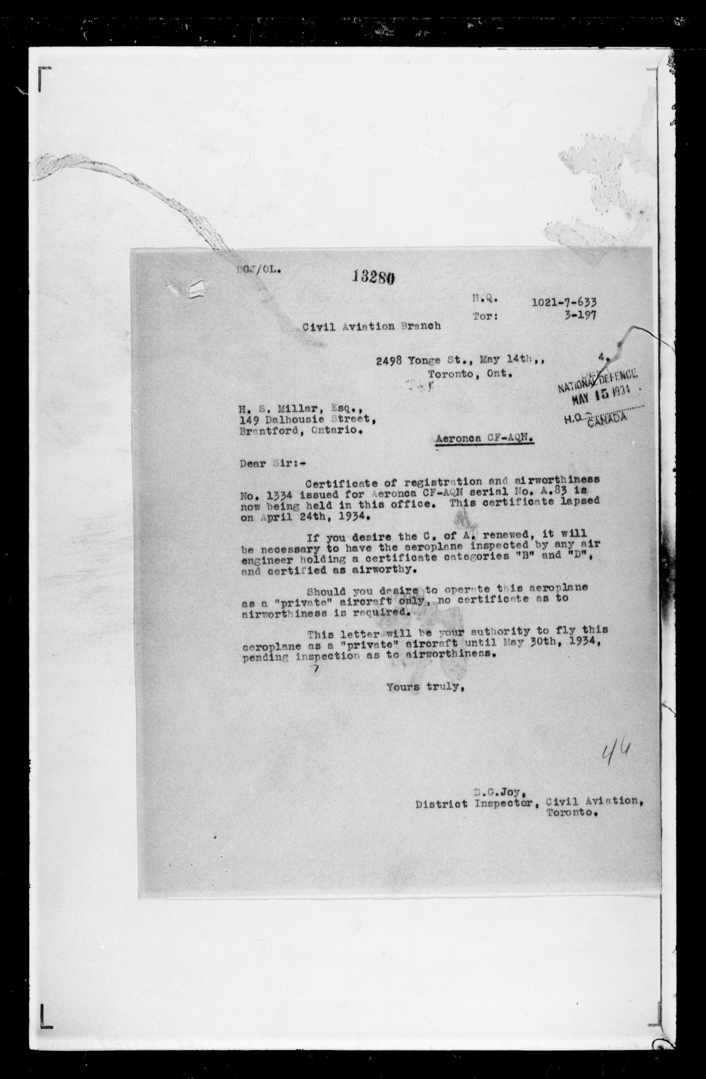 Department of Transport : Civil aircraft registration, inspection and operation files, block 5008, 1920-1986 - 7436