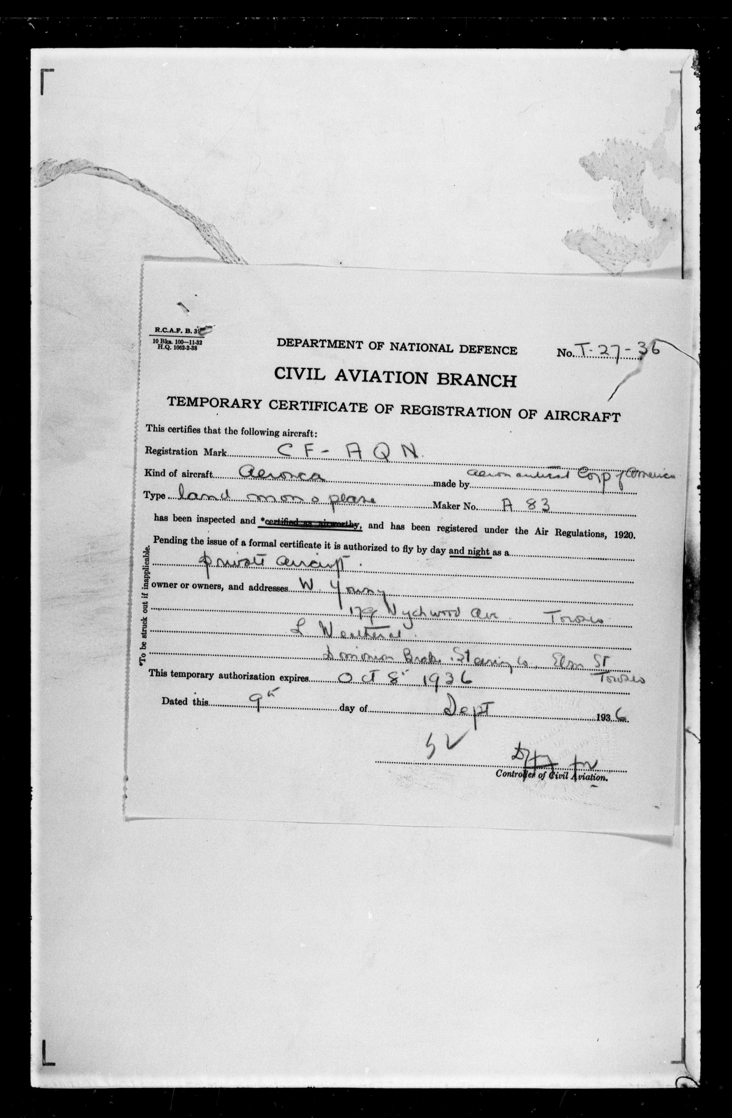 Department of Transport : Civil aircraft registration, inspection and operation files, block 5008, 1920-1986 - 7436