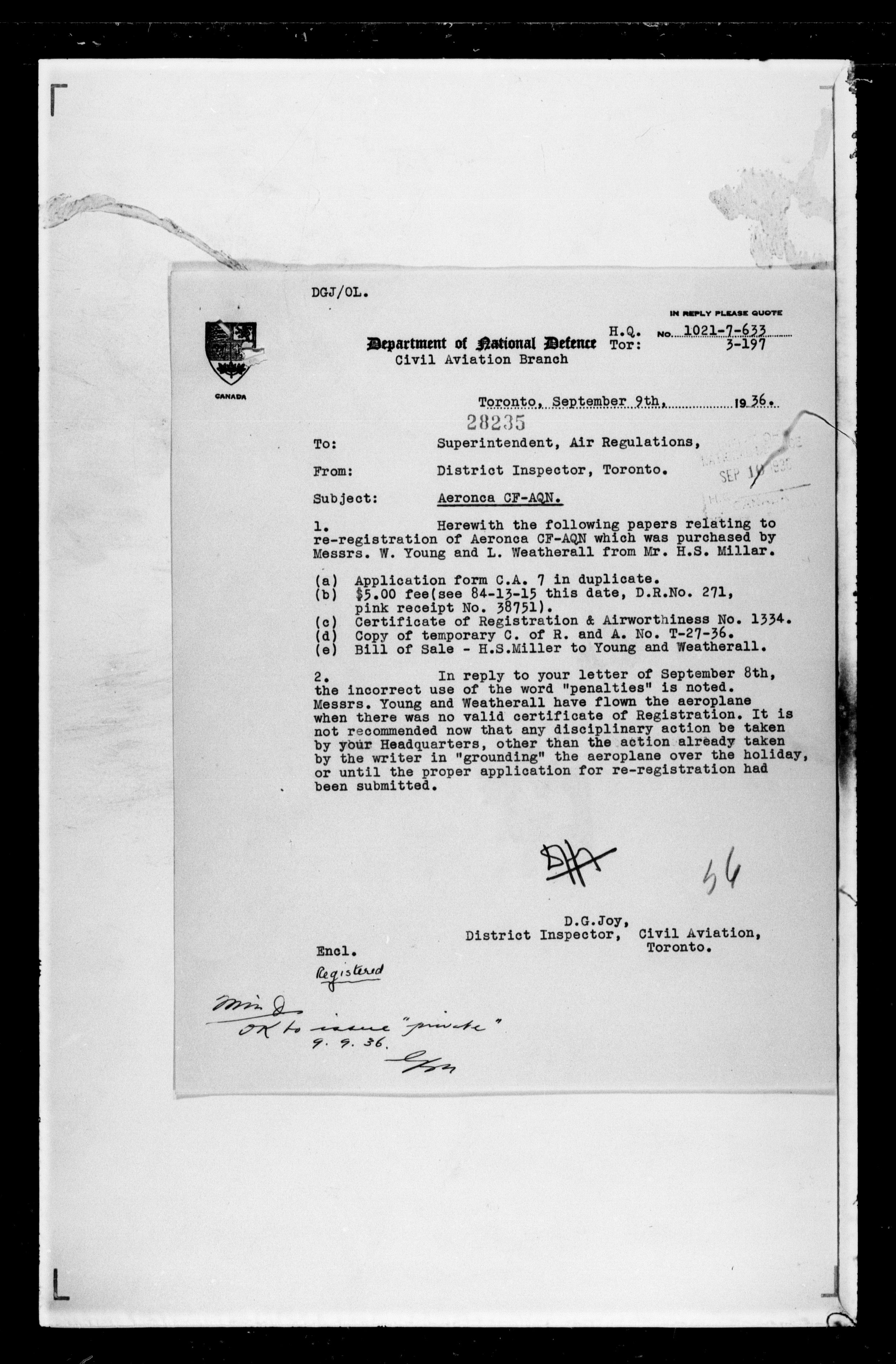 Department of Transport : Civil aircraft registration, inspection and operation files, block 5008, 1920-1986 - 7436