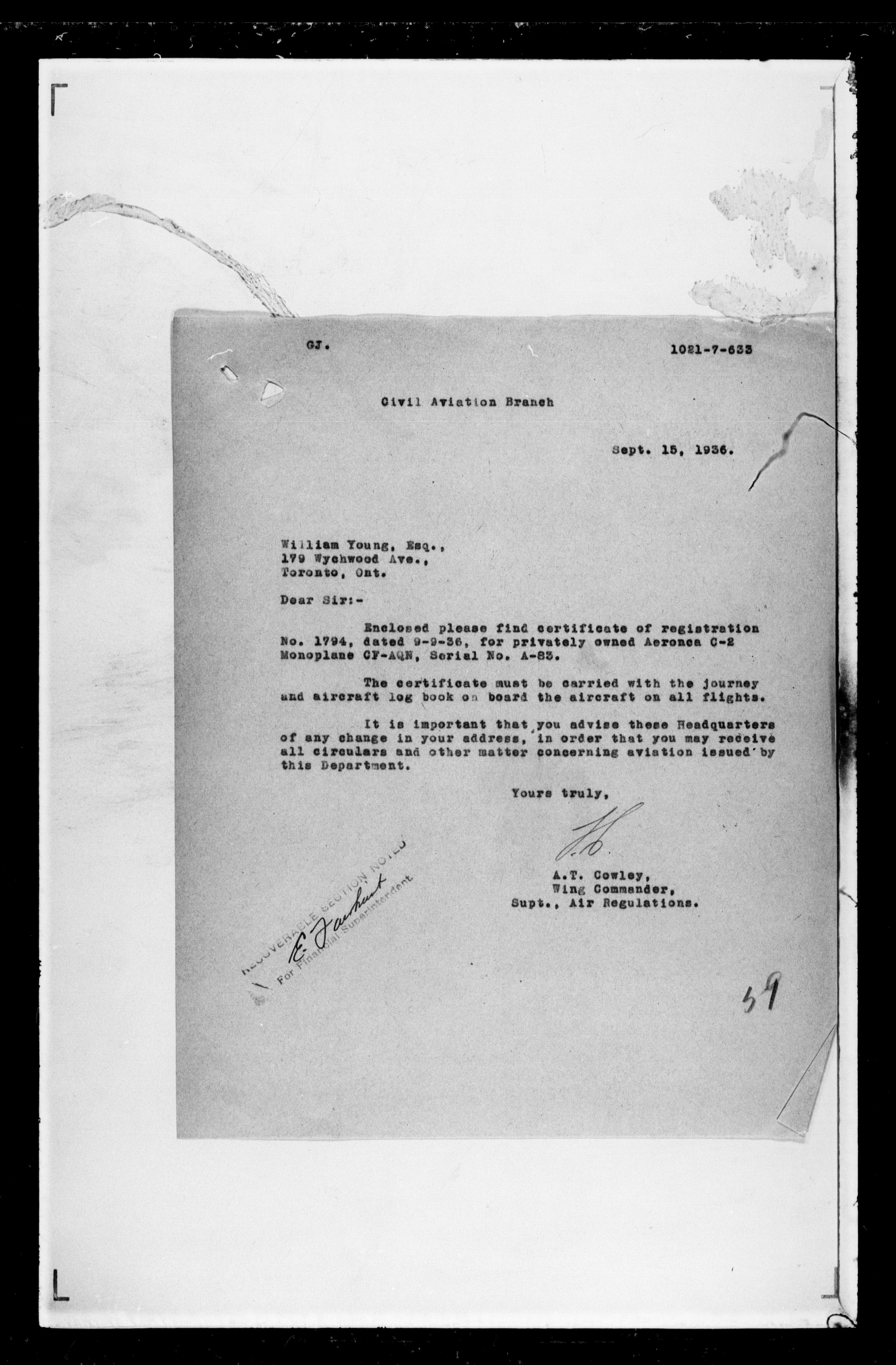 Department of Transport : Civil aircraft registration, inspection and operation files, block 5008, 1920-1986 - 7436