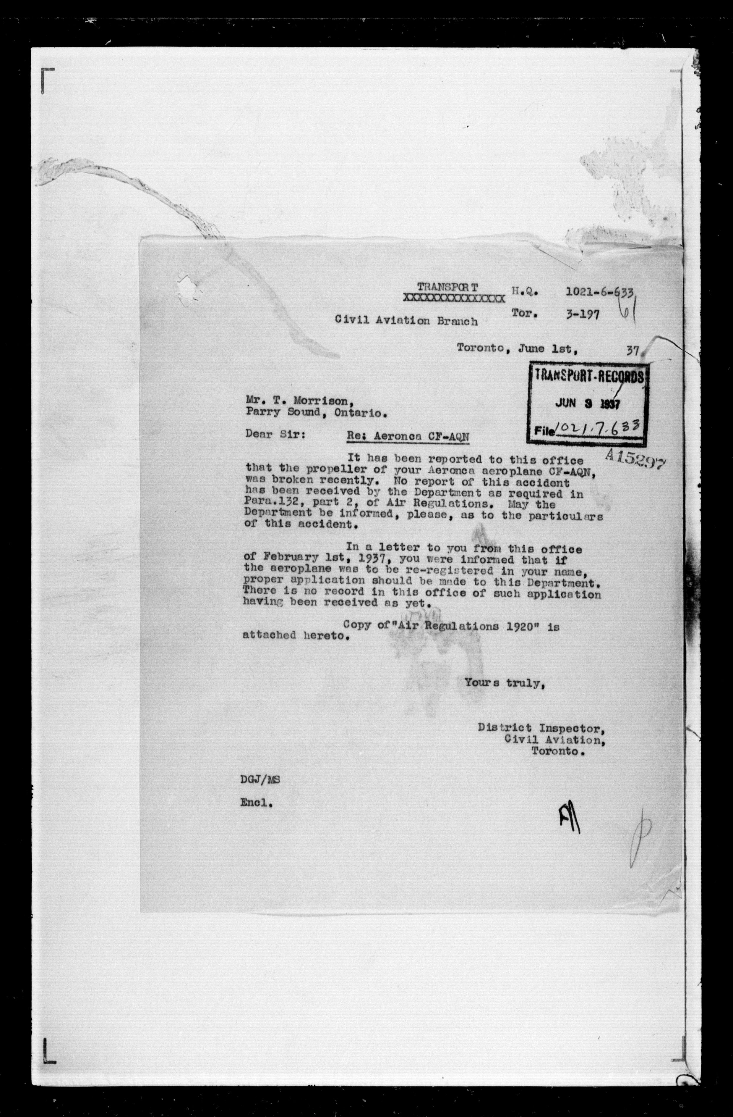 Department of Transport : Civil aircraft registration, inspection and operation files, block 5008, 1920-1986 - 7436