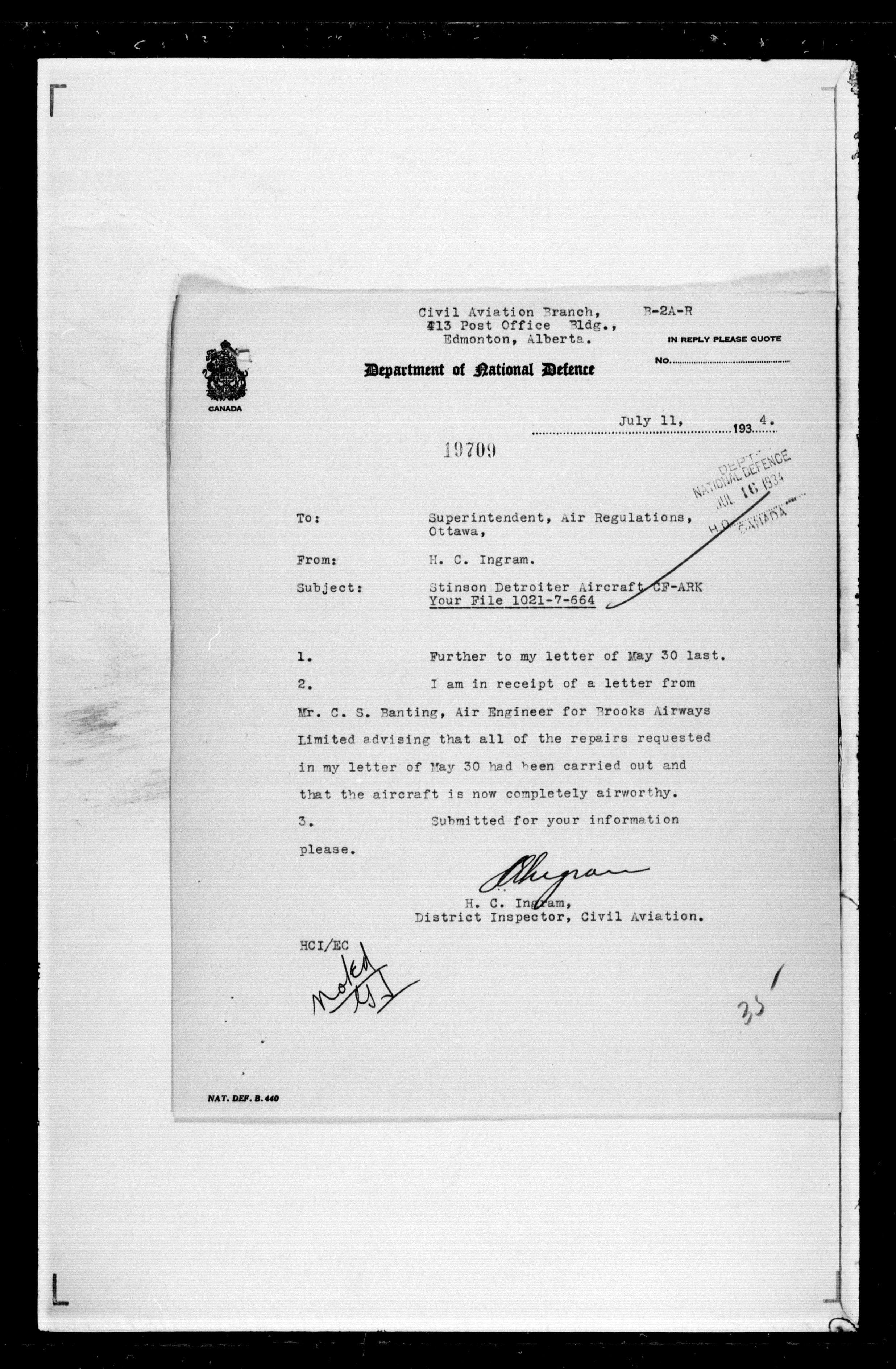 Department of Transport : Civil aircraft registration, inspection and operation files, 1920-1986 : T-7437
