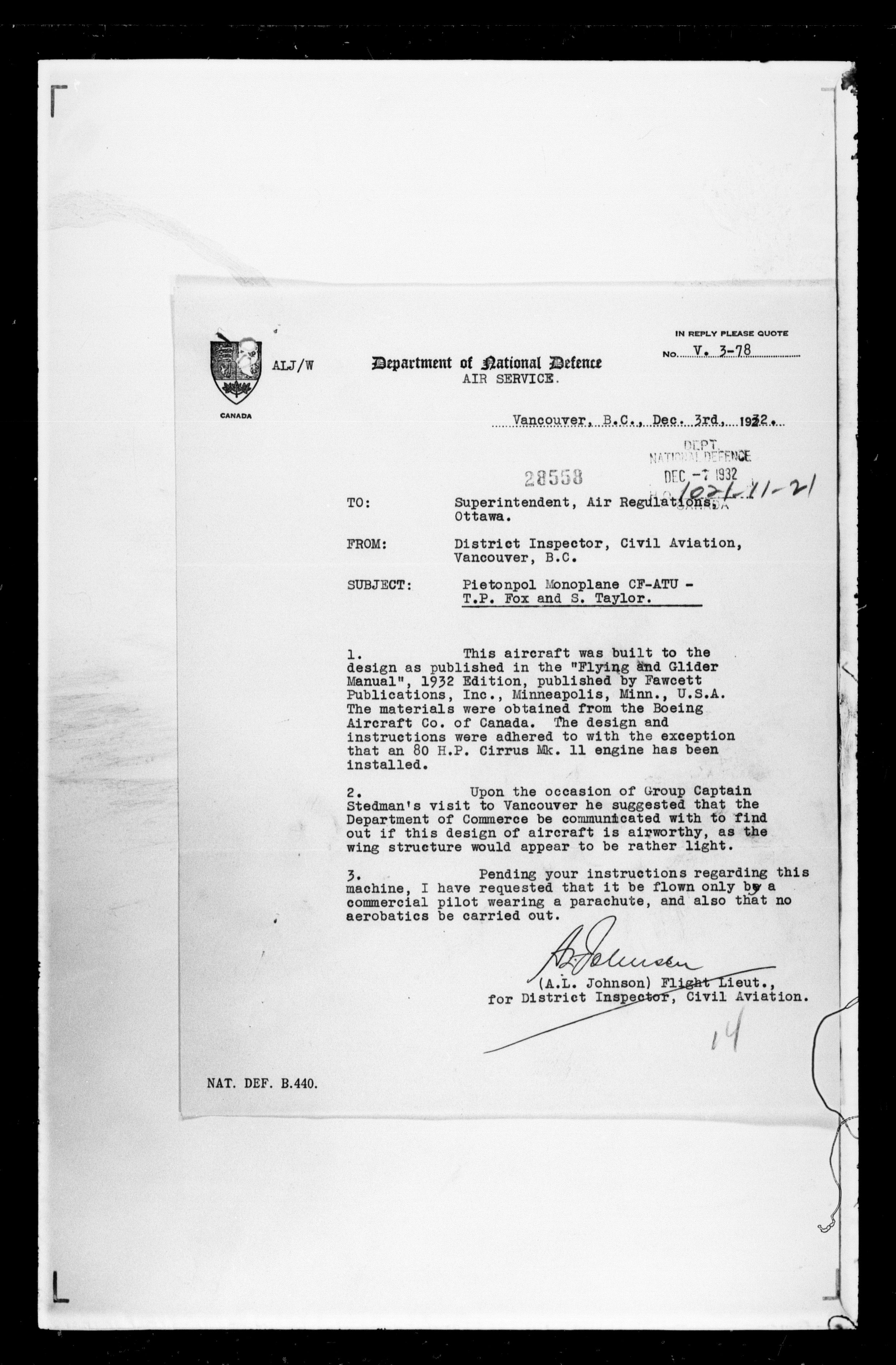 Department of Transport : Civil aircraft registration, inspection and operation files, block 5008, 1920-1986 - 7439