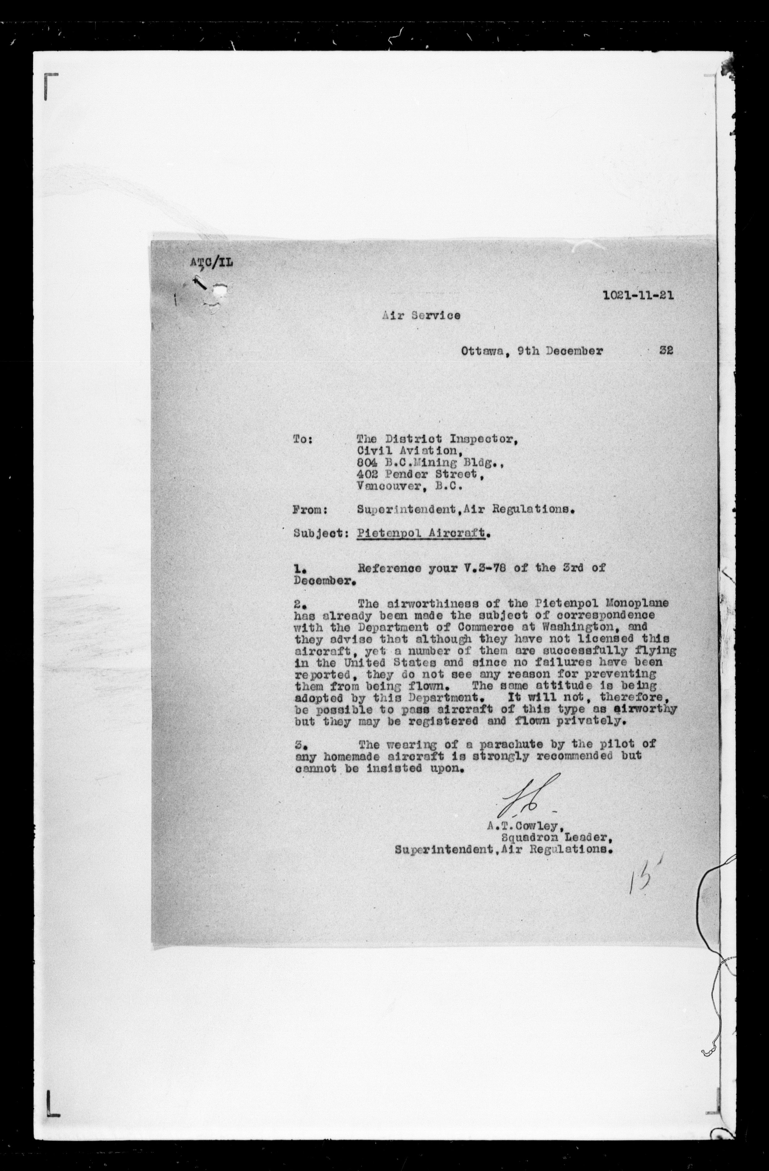 Department of Transport : Civil aircraft registration, inspection and operation files, block 5008, 1920-1986 - 7439