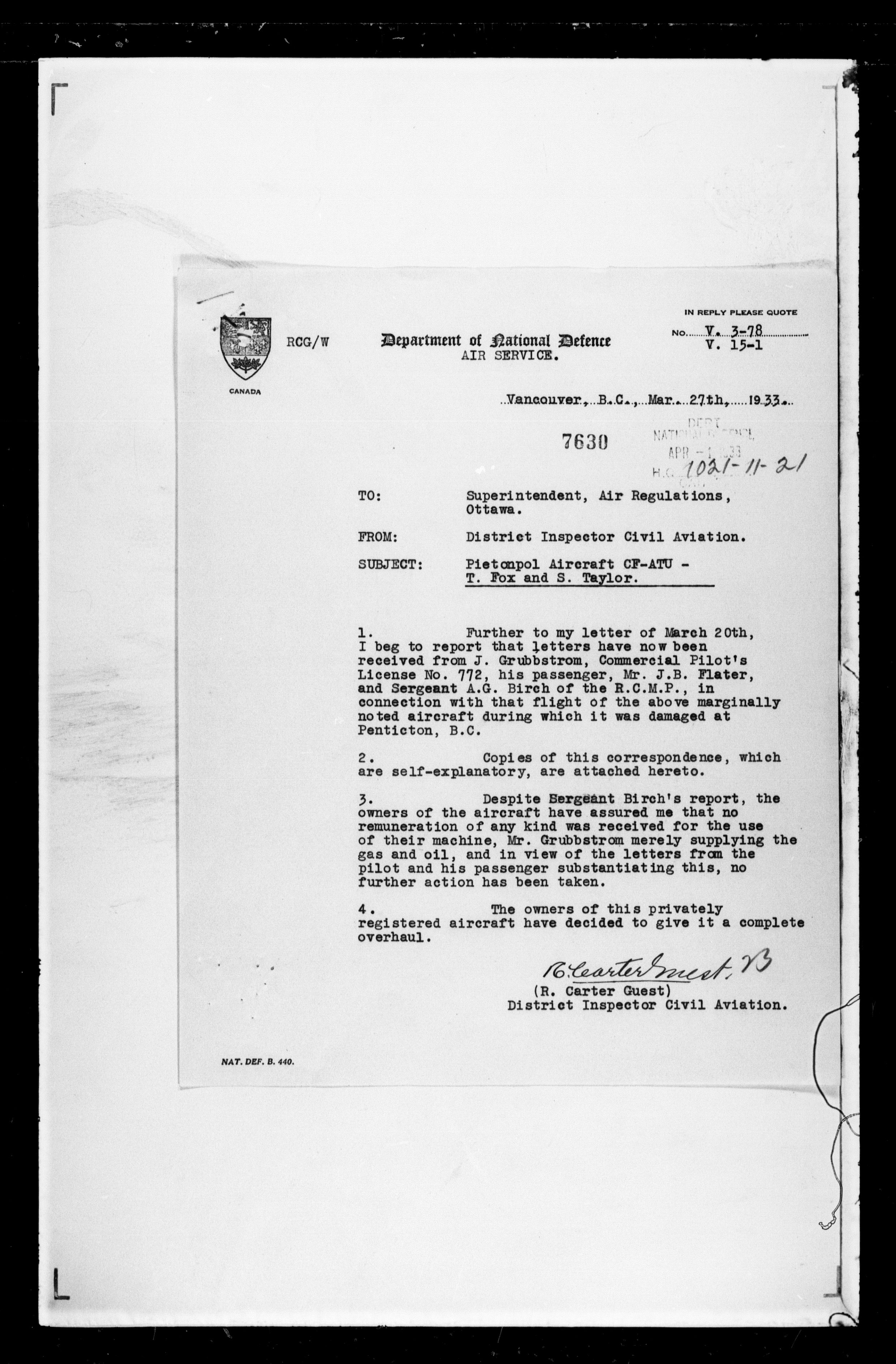 Department of Transport : Civil aircraft registration, inspection and operation files, block 5008, 1920-1986 - 7439