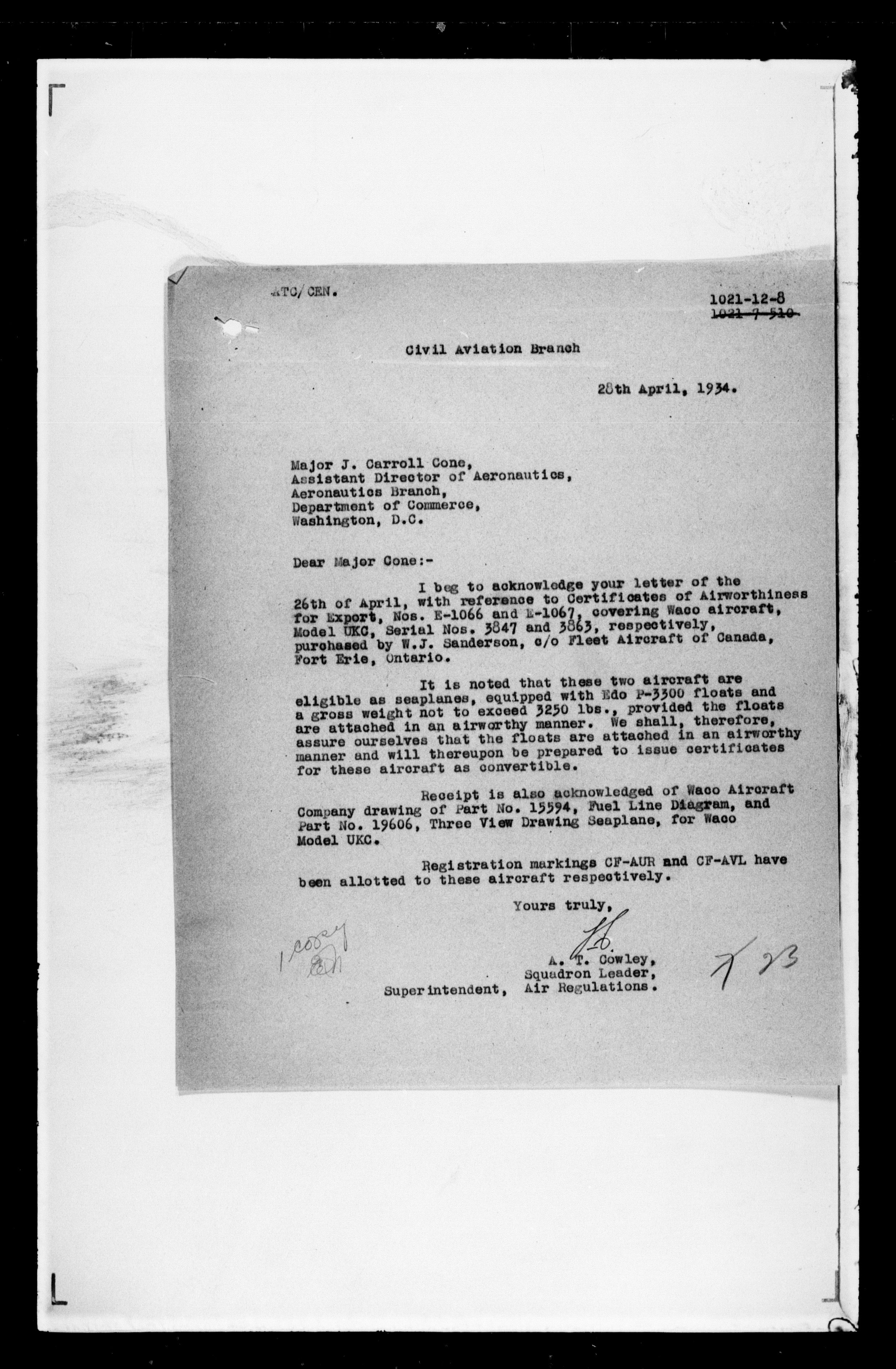 Department of Transport : Civil aircraft registration, inspection and operation files, block 5008, 1920-1986 - 7441