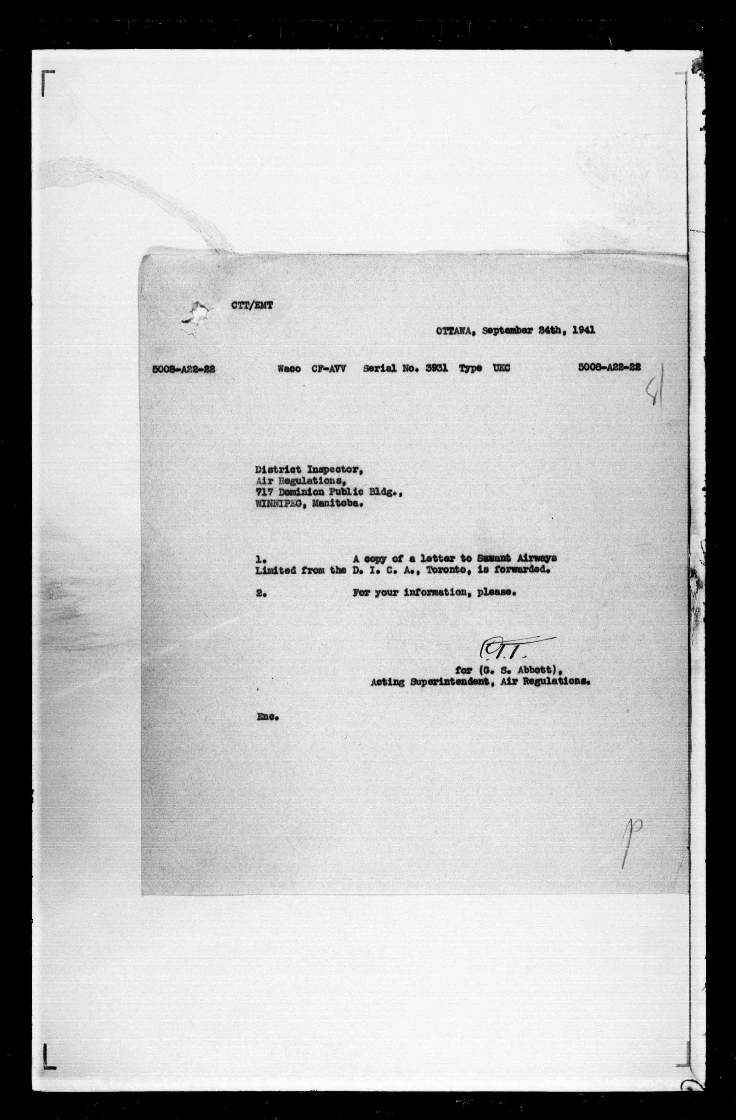 Department of Transport : Civil aircraft registration, inspection and operation files, 1920-1986 : T-7442