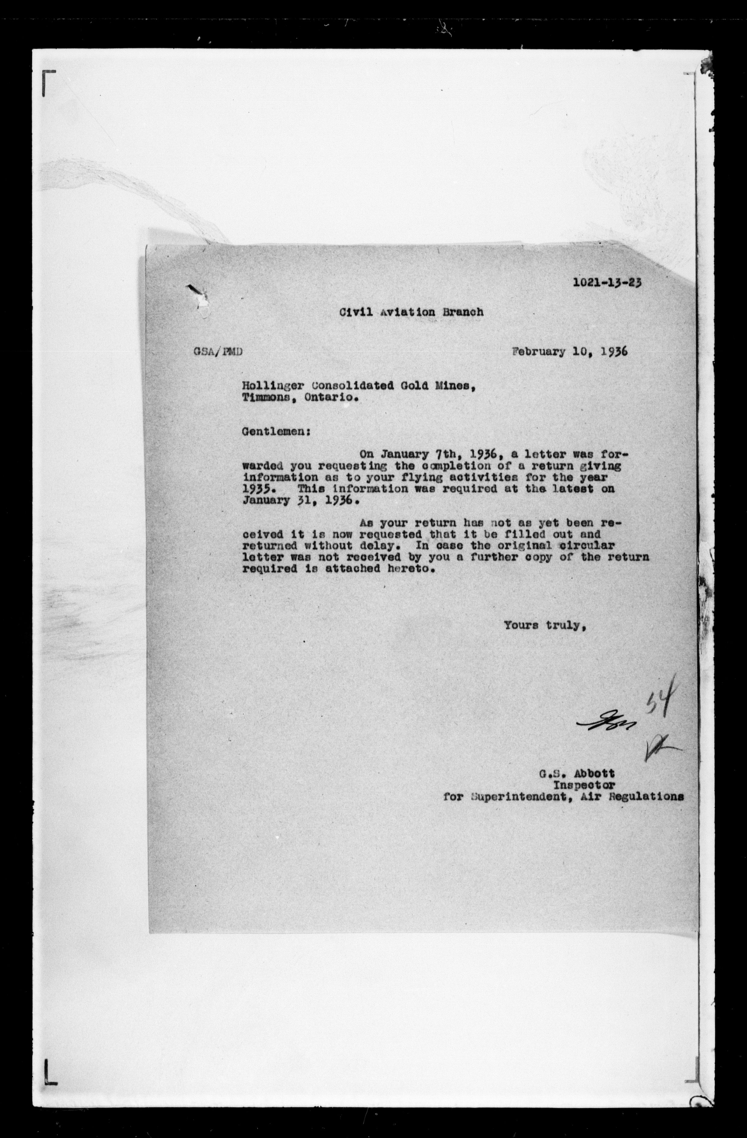 Department of Transport : Civil aircraft registration, inspection and operation files, 1920-1986 : T-7443