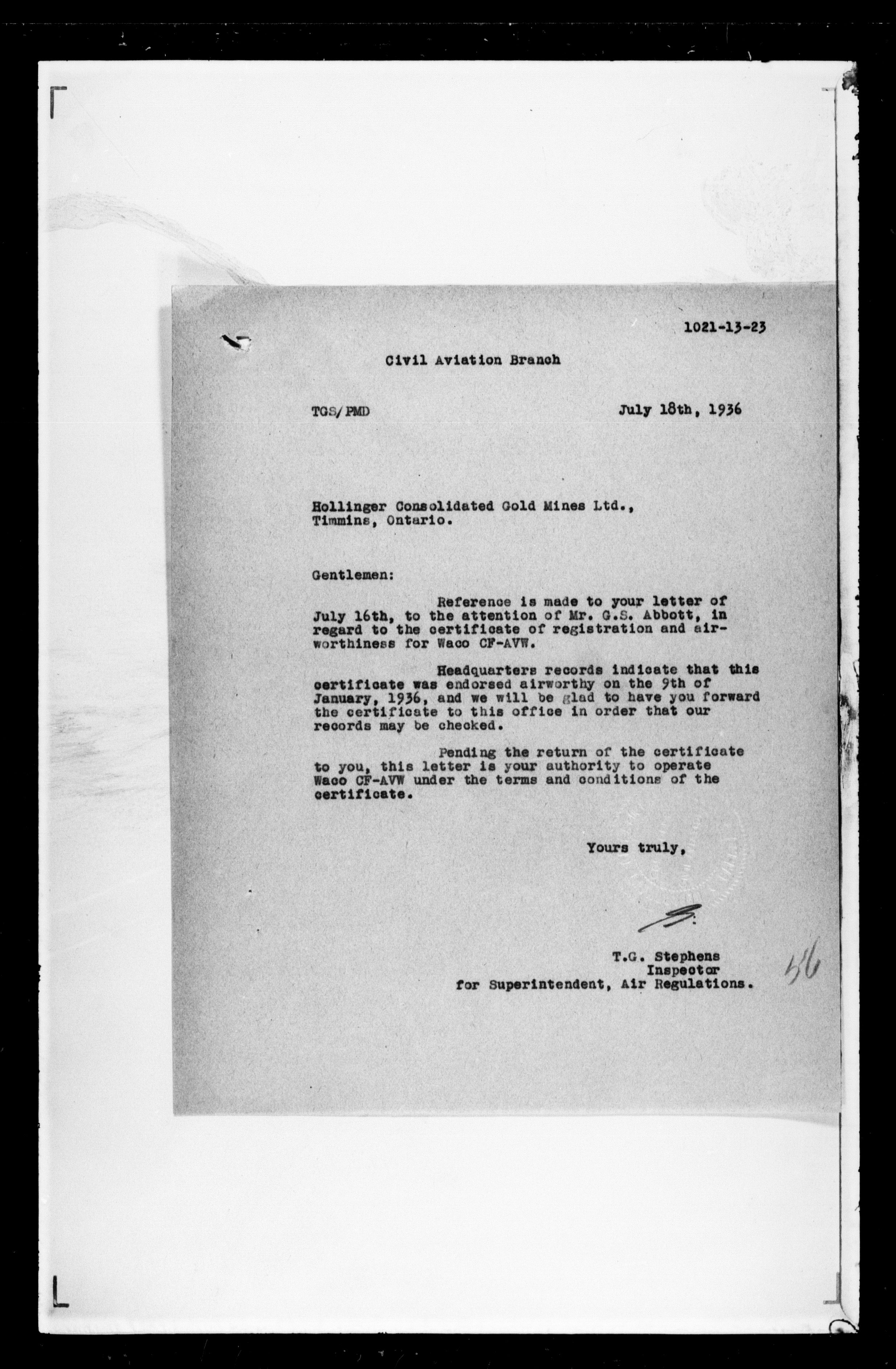 Department of Transport : Civil aircraft registration, inspection and operation files, 1920-1986 : T-7443